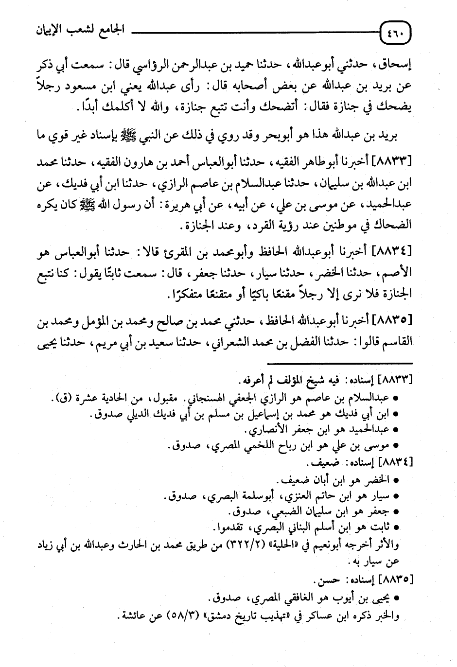 8833 - أَخْبَرَنَا أَبُو طَاهِرٍ الْفَقِيهُ، نا أَبُو الْعَبَّاسِ أَحْمَدُ بْنُ هَارُونَ الْفَقِيهُ، نا مُحَمَّدُ بْنُ عَبْدِ اللهِ بْنِ سُلَيْمَانَ، نا عَبْدُ السَّلَامِ بْنُ عَاصِمٍ الرَّازِيُّ، نا ابْنُ أَبِي فُدَيْكٍ، عَنْ عَبْدِ الْحَمِيدِ، عَنْ مُوسَى بْنِ عَلِيٍّ، عَنْ أَبِيهِ، عَنْ أَبِي هُرَيْرَةَ، أَنَّ رَسُولَ اللهِ صَلَّى اللَّهُ عَلَيْهِ وَسَلَّمَ كَانَ §يَكْرَهُ الضَّحِكَ فِي مَوْطِنَيْنِ عِنْدَ رُؤْيَةِ الْقِرْدِ وَعِنْدَ الْجِنَازَةِ