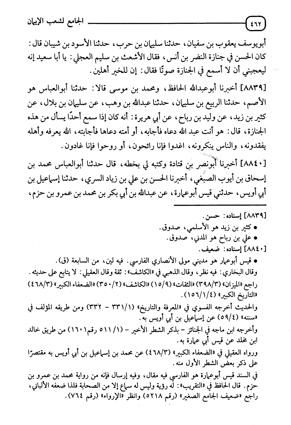 8839 - أَخْبَرَنَا أَبُو عَبْدِ اللهِ الْحَافِظُ وَمُحَمَّدُ بْنُ مُوسَى قَالَا: نا أَبُو الْعَبَّاسِ هُوَ الْأَصَمُّ، نا الرَّبِيعُ بْنُ سُلَيْمَانَ، نا عَبْدُ اللهِ بْنُ وَهْبٍ، عَنْ سُلَيْمَانَ بْنِ بِلَالٍ، عَنْ كَثِيرِ بْنِ زَيْدٍ، عَنْ وَلِيدِ بْنِ رَبَاحٍ، عَنْ أَبِي هُرَيْرَةَ أَنَّهُ كَانَ إِذَا سَمِعَ أَحَدًا يَسْأَلُ مَنْ هَذِهِ الْجِنَازَةِ؟ فَقَالَ: " §هُوَ أَنْتَ عَبْدُ اللهِ دَعَاهُ فَأَجَابَهُ، أَوْ أَمَتُهُ دَعَاهَا فَأَجَابَتْهُ، اللهُ يَعْرِفُهُ وَأَهْلُهُ يَفْقِدُونَهُ وَالنَّاسُ يُنْكِرُونَهُ، اغْدُوا فَإِنَّا رَائِحُونَ أَوْ رَوِّحُوا فَإِنَّا غَادُونَ "