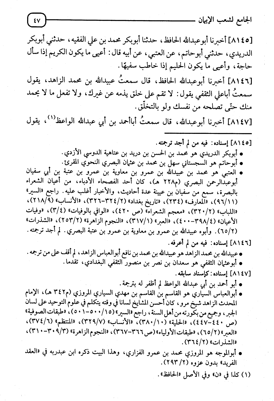 8146 - أَخْبَرَنَا أَبُو عَبْدِ اللهِ الْحَافِظُ، قَالَ: سَمِعْتُ عَبْدَ اللهِ بْنَ مُحَمَّدٍ الزَّاهِدَ، يَقُولُ: سَمِعْتُ أَبَا عَلِيٍّ الثَّقَفِيَّ، يَقُولُ: " §لَا تَقُمْ عَلَى خُلُقٍ تَذُمُّهُ مِنْ غَيْرِكَ، وَلَا تَفْعَلْ مَا لَا يُحْمَدُ مِنْكَ حَتَّى تُصْلِحَهُ مِنْ نَفْسِكَ وَلَوْ بِالتَّخَلُّقِ "