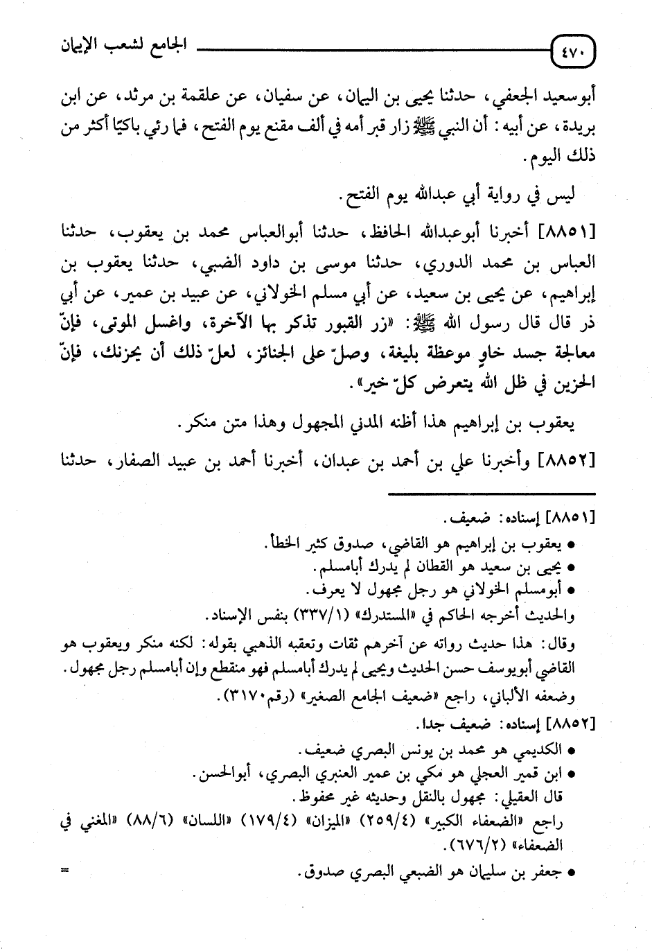 8851 - أَخْبَرَنَا أَبُو عَبْدِ اللهِ الْحَافِظُ، نا أَبُو الْعَبَّاسِ مُحَمَّدُ بْنُ يَعْقُوبَ، نا الْعَبَّاسُ بْنُ مُحَمَّدٍ الدُّورِيُّ، نا مُوسَى بْنُ دَاوُدَ الضَّبِّيُّ، نا يَعْقُوبُ بْنُ إِبْرَاهِيمَ، عَنْ يَحْيَى بْنِ سَعِيدٍ، عَنْ أَبِي مُسْلِمٍ الْخَوْلَانِيِّ، عَنْ عُبَيْدِ بْنِ عُمَيْرٍ، عَنْ أَبِي ذَرٍّ قَالَ: قَالَ لِي رَسُولُ اللهِ صَلَّى اللَّهُ عَلَيْهِ وَسَلَّمَ: " §زُرِ الْقُبُورَ تَذْكُرُ بِهَا الْآخِرَةَ، وَاغْسِلِ الْمَوْتَى، فَإِنَّ مُعَالَجَةَ جَسَدٍ خَاوٍ مَوْعِظَةٌ بَلِيغَةٌ، وَصَلِّ عَلَى الْجَنَائِزِ لَعَلَّ ذَلِكَ أَنْ يَحْزُنْكَ، فَإِنَّ الْحَزِينَ فِي ظِلِّ اللهِ يَتَعَرَّضُ كُلَّ خَيْرٍ " يَعْقُوبُ بْنُ إِبْرَاهِيمَ هَذَا أَظُنُّهُ الْمَدَنِيَّ الْمَجْهُولَ، وَهَذَا مَتْنٌ مُنْكَرٌ