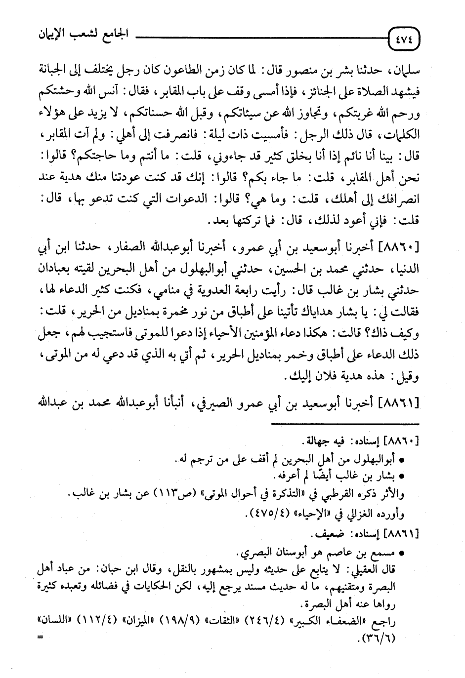 8861 - أَخْبَرَنَا أَبُو سَعِيدِ بْنُ أَبِي عَمْرٍو الصَّيْرَفِيُّ أنا أَبُو عَبْدِ اللهِ مُحَمَّدُ بْنُ عَبْدِ اللهِ -[475]- الصَّفَّارُ نا أَبُو بَكْرِ بْنُ أَبِي الدُّنْيَا حَدَّثَنِي مُحَمَّدُ بْنُ الْحُسَيْنِ نا يَحْيَى بْنُ بِسْطَامٍ الْأَصْفَرُ حَدَّثَنِي مَسْمَعُ بْنُ عَاصِمٍ، حَدَّثَنِي رَجُلُ مِنْ آلِ عَاصِمٍ الْجَحْدَرِيُّ قَالَ: رَأَيْتُ عَاصِمَ الْجَحْدَرِيَّ فِي مَنَامِي بَعْدَ مَوْتِهِ بِسَنَتَيْنِ فَقُلْتُ: أَلَيْسَ قَدِمْتَ؟ قَالَ بَلَى قُلْتُ: فَأَيْنَ أَنْتَ؟ قَالَ إِنَّا وَاللهِ §فِي رَوْضَةٍ مِنْ رِيَاضِ الْجَنَّةِ أَنَا وَنَفَرٌ مِنْ أَصْحَابِي نَجْتَمِعُ كُلَّ لَيْلَةِ جُمُعَةٍ وَصَبِيحَتِهَا إِلَى بَكْرِ بْنِ عَبْدِ اللهِ الْمُزَنِيِّ فَنَتَلَاقَى أَخْبَارَكُمْ قَالَ قُلْتُ: أَجْسَامُكُمْ أُمُّ أَرْوَاحُكُمْ؟ فَقَالَ هَيْهَاتَ بَلِيَتِ الْأَجْسَامُ وَإِنَّمَا تَلَاقِي الْأَرْوَاحِ. قَالَ فَقُلْتُ: فَهَلْ تَعْلَمُونَ بِزِيَارَتِنَا إِيَّاكُمْ؟ قَالَ نَعْلَمُ بِهَا عَشِيَّةَ الْجُمُعَةِ وَيَوْمَ الْجُمُعَةِ كُلَّهُ وَيَوْمَ السَّبْتِ إِلَى طُلُوعِ الشَّمْسِ. قَالَ قُلْتُ: وَكَيْفَ ذَلِكَ دُونَ الْأَيَّامِ كُلِّهَا؟ قَالَ لِفَضْلِ يَوْمِ الْجُمُعَةِ وَعِظَمِهِ "