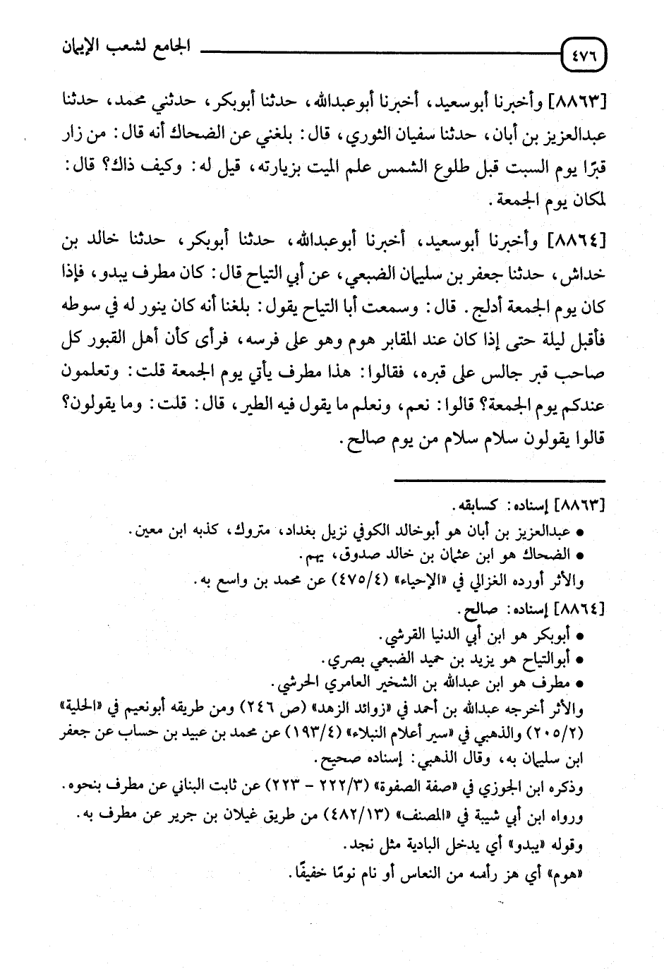 8863 - وَأَخْبَرَنَا أَبُو سَعِيدٍ أنا أَبُو عَبْدِ اللهِ نا أَبُو بَكْرٍ حَدَّثَنِي مُحَمَّدُ نا عَبْدُ الْعَزِيزُ بْنُ أَبَانَ أنا سُفْيَانُ الثَّوْرِيُّ قَالَ بَلَغَنِي عَنِ الضَّحَّاكِ أَنَّهُ قَالَ: §" مِنْ زَارَ قَبْرًا يَوْمَ السَّبْتِ قَبْلَ طُلُوعِ الشَّمْسِ عَلِمَ الْمَيِّتُ بِزِيَارَتِهِ. قِيلَ لَهُ: وَكَيْفَ ذَاكَ؟ قَالَ: لِمَكَانِ يَوْمِ الْجُمُعَةِ "