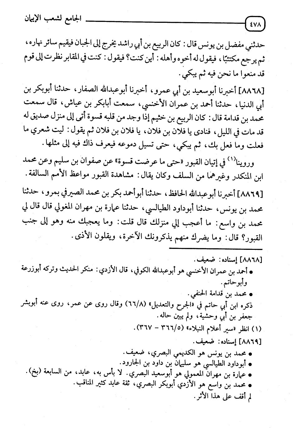 8868 - أَخْبَرَنَا أَبُو سَعِيدِ بْنُ أَبِي عَمْرِو أنا أَبُو عَبْدِ اللهِ الصَّفَّارُ نا أَبُو بَكْرِ بْنُ أَبِي الدُّنْيَا نا أَحْمَدُ بْنُ عِمْرَانَ الْأَخْنَسِيُّ سَمِعْتُ أَبَا بَكْرِ بْنِ عَيَّاشٍ قَالَ سَمِعْتُ مُحَمَّدَ بْنَ قُدَامَةَ قَالَ كَانَ الرَّبِيعُ بْنُ خَيْثَمٍ §إِذَا وَجَدَ مِنْ قَلْبِهِ قَسْوَةً أَتَى مَنْزِلَ صَدِيقٍ لَهُ قَدْ مَاتَ فِي اللَّيْلِ فَنَادَى يَا فُلَانُ بْنُ فُلَانٍ يَا فُلَانُ بْنُ فُلَانٍ ثُمَّ يَقُولُ: " لَيْتَ شِعْرِي مَا فَعَلْتَ وَمَا فُعِلَ بِكَ؟ "، ثُمَّ يَبْكِي حَتَّى تَسِيلَ دُمُوعَهُ فَيَعْرِفُ ذَاكَ فِيهِ إِلَى مِثْلِهَا وَرُوِّينَا فِي إِتْيَانِ الْقُبُورِ مَتَى مَا عُرِضَتْ قَسْوَةُ، عَنْ صَفْوَانَ بْنِ سُلَيْمِ وَعَنْ مُحَمَّدِ بْنِ الْمُنْكَدِرِ وَغَيْرُهُمَا مِنَ السَّلَفِ. وَكَانَ يُقَالُ: مُشَاهَدَةُ الْقُبُورِ مَوَاعِظُ الْأُمَمِ السَّالِفَةِ