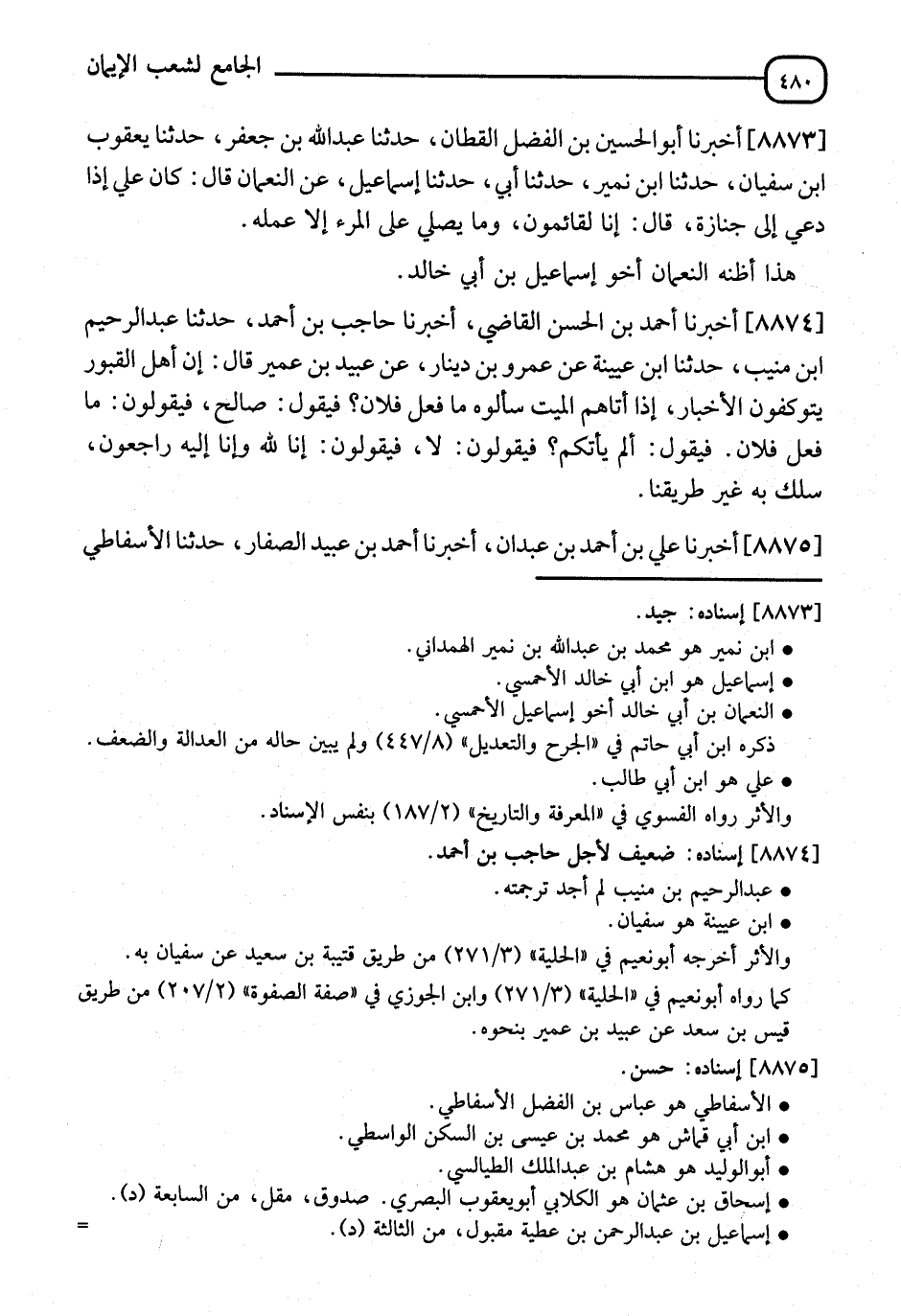 8873 - أَخْبَرَنَا أَبُو الْحُسَيْنِ بْنِ الْفَضْلِ الْقَطَّانُ أنا عَبْدُ اللهِ بْنُ جَعْفَرٍ نا يَعْقُوبُ بْنُ سُفْيَانَ نا ابْنُ نُمَيْرٍ نا أَبِي نا إِسْمَاعِيلُ عَنِ النُّعْمَانِ قَالَ كَانَ عَلِيٌّ إِذَا دُعِيَ إِلَى جِنَازَةَ قَالَ: §" إِنَّا لَقَائِمُونَ وَمَا يُصَلِّي عَلَى الْمَرْءِ إِلَّا عَمَلُهُ " هَذَا أَظُنُّهُ النُّعْمَانُ أَخُو إِسْمَاعِيلَ بْنُ أَبِي خَالِدٍ