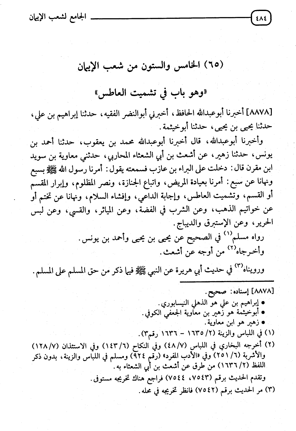 §الْخَامِسُ وَالسِّتُّونَ مِنْ شُعَبِ الْإِيمَانِ وَهُوَ بَابٌ فِي تَشْمِيتِ الْعَاطِسِ