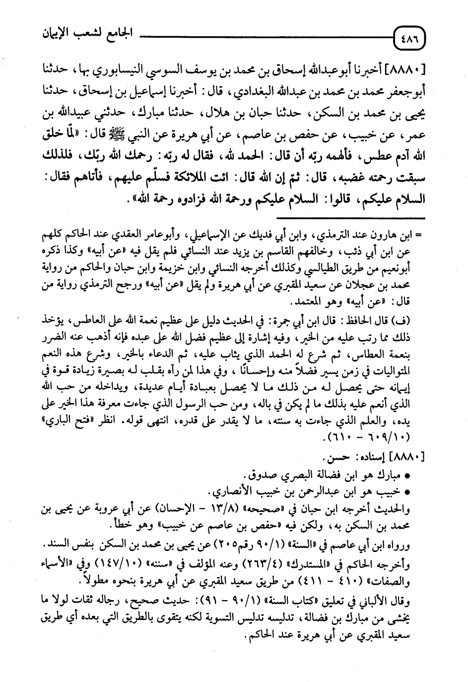 8880 - أَخْبَرَنَا أَبُو عَبْدِ اللهِ إِسْحَاقُ بْنُ مُحَمَّدِ بْنِ يُوسُفَ السُّوسِيُّ النَّيْسَابُورِيُّ بِهَا نا أَبُو جَعْفَرٍ مُحَمَّدُ بْنُ مُحَمَّدِ بْنِ عَبْدِ اللهِ الْبَغْدَادِيُّ قَالَ أنا إِسْمَاعِيلُ بْنُ إِسْحَاقَ نا يَحْيَى بْنُ مُحَمَّدِ بْنِ السَّكَنِ نا حَبَّانُ بْنُ هِلَالٍ نا مُبَارَكٌ حَدَّثَنِي عُبَيْدُ اللهِ بْنُ عُمَرَ عَنْ حَبِيبٍ عَنْ حَفْصِ بْنِ عَاصِمٍ عَنْ أَبِي هُرَيْرَةَ عَنِ النَّبِيِّ صَلَّى اللَّهُ عَلَيْهِ وَسَلَّمَ قَالَ: §" لَمَّا خَلَقَ اللهُ آدَمَ عَطَسَ فَأَلْهَمَهُ رَبُّهُ أَنْ قَالَ الْحَمْدُ لِلَّهِ فَقَالَ لَهُ رَبُّهُ: رَحِمَكَ اللهُ رَبُّكَ؛ فَلِذَلِكَ سَبَقَتْ رَحْمَتُهُ غَضَبَهُ " قَالَ: " ثُمَّ إِنَّ اللهَ قَالَ ائْتِ الْمَلَائِكَةَ فَسَلِّمْ عَلَيْهِمْ، فَأَتَاهُمْ فَقَالَ: السَّلَامُ عَلَيْكُمْ. قَالُوا: السَّلَامُ عَلَيْكَ وَرَحْمَةُ اللهِ فَزَادُوهُ رَحْمَةَ اللهِ "