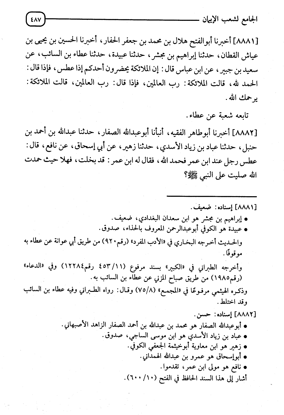 8881 - أَخْبَرَنَا أَبُو الْفَتْحِ هِلَالُ بْنُ مُحَمَّدِ بْنِ جَعْفَرٍ الْحَفَّارُ أنا الْحُسَيْنُ بْنُ يَحْيَى بْنِ عَيَّاشٍ الْفَظَّانُ نا إِبْرَاهِيمُ بْنُ مُجَشِّرٍ نا عَبِيدَةُ نا عَطَاءُ بْنُ السَّائِبِ عَنْ سَعِيدِ بْنِ جُبَيْرٍ عَنِ ابْنِ عَبَّاسٍ قَالَ: " إِنَّ §الْمَلَائِكَةَ يَحْضُرُونَ أَحَدَكُمْ إِذَا عَطَسَ فَإِذَا قَالَ الْحَمْدُ لِلَّهِ، قَالَتِ الْمَلَائِكَةُ رَبِّ الْعَالَمِينَ، فَإِذَا قَالَ رَبِّ الْعَالَمِينَ، قَالَتِ الْمَلَائِكَةُ يَرْحَمُكَ اللهُ " تَابَعَهُ شُعْبَةُ عَنْ عَطَاءٍ