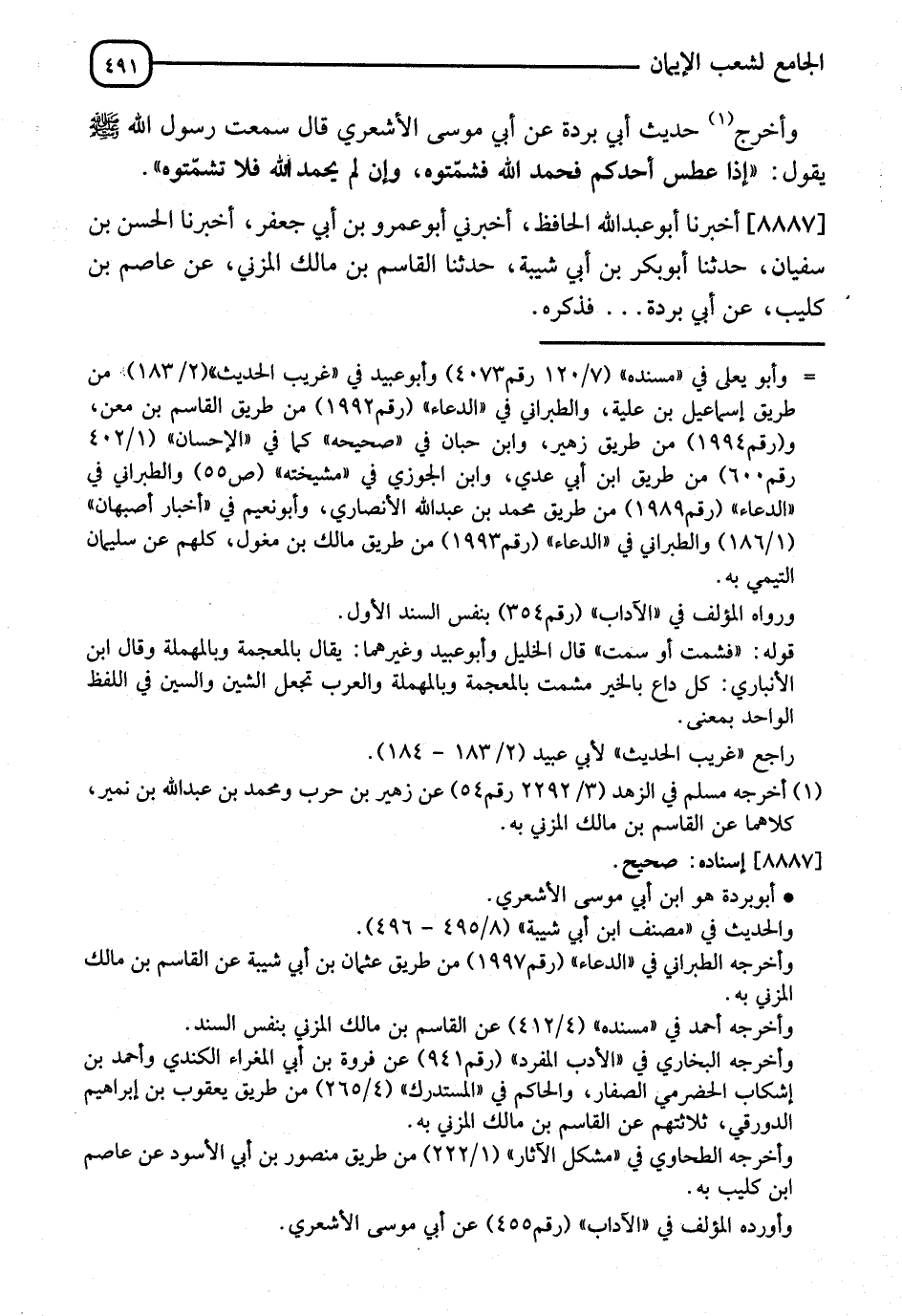 وَأَخْرَجَ حَدِيثَ أَبِي بُرْدَةَ عَنْ أَبِي مُوسَى الْأَشْعَرِيِّ قَالَ سَمِعْتُ رَسُولَ اللهِ صَلَّى اللَّهُ عَلَيْهِ وَسَلَّمَ يَقُولُ: §" إِذَا عَطَسَ أَحَدُكُمْ فَحَمِدَ اللهَ فَشَمِّتُوهُ وَإِذَا لَمْ يَحْمَدِ اللهَ فَلَا تُشَمِّتُوهُ "