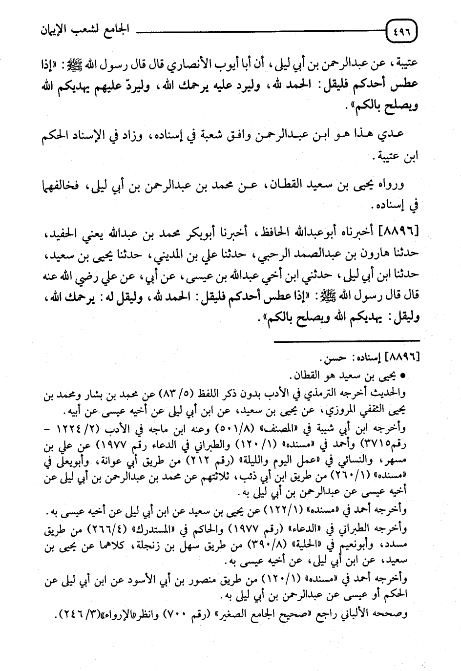 8896 - أَخْبَرَنَاهُ أَبُو عَبْدِ اللهِ الْحَافِظُ , أنا أَبُو بَكْرٍ مُحَمَّدُ بْنُ عَبْدِ اللهِ يَعْنِي الْحَفِيدَ , نا هَارُونُ بْنُ عَبْدِ الصَّمَدِ الرَّحَبِيُّ , نا عَلِيُّ بْنُ الْمَدِينِيُّ , نا يَحْيَى بْنُ سَعِيدٍ , نا ابْنُ أَبِي لَيْلَى , حَدَّثَنِي ابْنُ أَخِي عَبْدُ اللهِ بْنُ عِيسَى , عَنْ أَبِي , عَنْ عَلِيِّ بْنِ أَبِي طَالِبٍ رَضِيَ اللهُ عَنْهُ , قَالَ: قَالَ رَسُولُ اللهِ صَلَّى اللَّهُ عَلَيْهِ وَسَلَّمَ: " §إِذَا عَطَسَ أَحَدُكُمْ فَلْيَقُلِ: الْحَمْدُ لِلَّهِ , وَلْيَقُلْ لَهُ: يَرْحَمُكُمُ اللهُ , وَلْيَقُلْ: يَهْدِيكُمُ اللهُ وَيُصْلِحُ بَالَكُمْ "