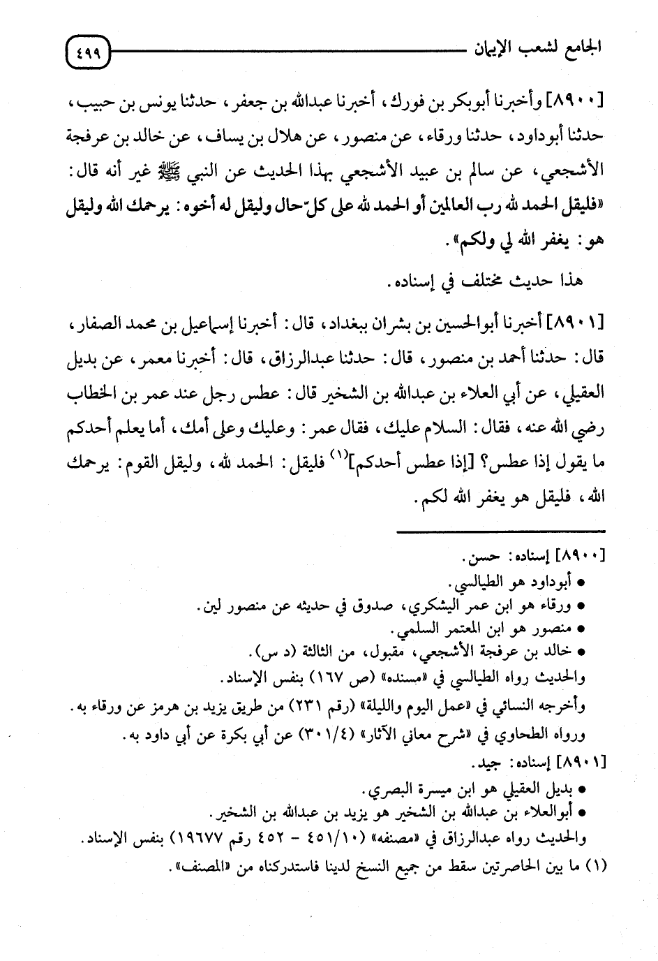 8901 - أَخْبَرَنَا أَبُو الْحُسَيْنِ بْنُ بُشْرَانَ , بِبَغْدَادَ , قَالَ: أنا إِسْمَاعِيلُ بْنُ مُحَمَّدٍ الصَّفَّارُ , قَالَ: نا أَحْمَدُ بْنُ مَنْصُورٍ , قَالَ: نا عَبْدُ الرَّزَّاقِ , قَالَ: أنا مَعْمَرٌ , عَنْ بُدَيْلٍ الْعُقَيْلِيِّ , عَنْ أَبِي الْعَلَاءِ بْنِ عَبْدِ اللهِ بْنِ الشِّخِّيرِ , قَالَ: عَطَسَ رَجُلٌ عِنْدَ عُمَرَ بْنِ الْخَطَّابِ رَضِيَ اللهُ عَنْهُ فَقَالَ: السَّلَامُ عَلَيْكَ , فَقَالَ عُمَرُ: " وَعَلَيْكَ السَّلَامُ وَعَلَى أُمِّكَ , أَمَا يَعْلَمُ أَحَدُكُمْ مَا يَقُولُ: §إِذَا عَطَسَ فَلْيَقُلِ: الْحَمْدُ لِلَّهِ , وَلْيَقُلِ الْقَوْمُ: يَرْحَمُكَ اللهُ , وَلْيَقُلْ هُوَ: يَغْفِرُ اللهُ لَكُمْ "