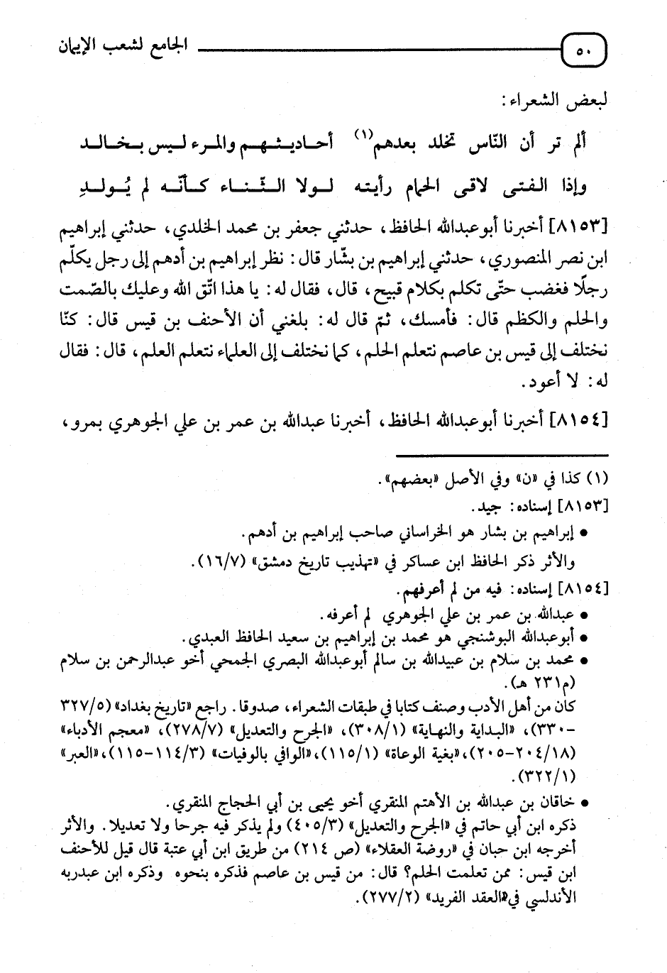 8154 - أَخْبَرَنَا أَبُو عَبْدِ اللهِ الْحَافِظُ، أنا عَبْدُ اللهِ بْنُ عُمَرَ بْنِ عَلِيٍّ الْجَوْهَرِيُّ بِمَرْوَ، -[51]- نا أَبُو عَبْدِ اللهِ الْبُوشَنْجِيُّ بِمَرْوَ، نا مُحَمَّدُ بْنُ سَلَّامٍ الْجُمَحِيُّ أَبُو عَبْدِ الرَّحْمَنِ بْنُ سَلَّامٍ، قَالَ: زَعَمَ خَاقَانُ بْنُ الْأَهْتَمِ، قَالَ: قَالَ الْأَحْنَفُ بْنُ قَيْسٍ: تَعَلَّمُوا الْحِلْمَ تَعَلُّمًا، وَلَقَدْ تَعَلَّمْتُهُ مِنْ قَيْسِ بْنِ عَاصِمٍ، ثُمَّ قَالَ: أُتِيَ قَيْسُ بْنُ عَاصِمٍ بِابْنِهِ قَتِيلًا، فَجَاءُوا بِقَاتِلِهِ وَهُوَ أَحَدُ بَنِي عَمِّهِ، فَقَالَ لَهُ: " §نَقَصْتَ عَدَدَكَ، وَأَوْهَنْتَ عِزَّكَ، وَقَتَلْتَ ابْنَ عَمِّكَ، وَقَدْ عَفَوْتُ عَنْكَ، وَإِنَّ أُمَّهُ لَثَكْلَى، وَقَدْ حَمَلْتُ لَهَا مِائَةً مِنَ الْإِبِلِ مِنْ مَالِي "