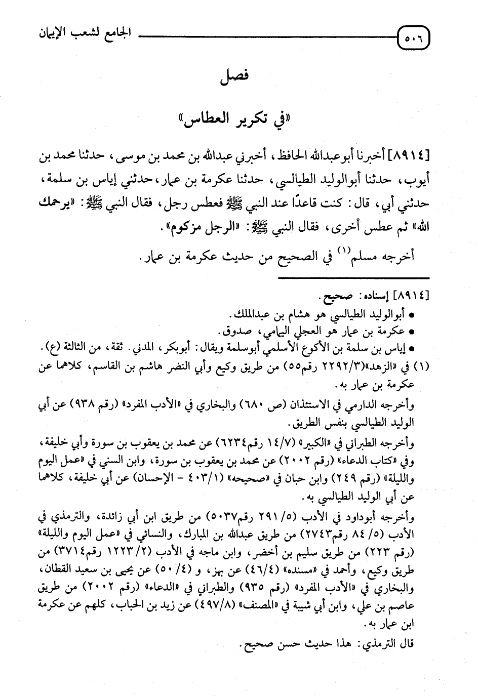 8914 - أَخْبَرَنَا أَبُو عَبْدِ اللهِ الْحَافِظُ , أَخْبَرَنِي عَبْدُ اللهِ بْنُ مُحَمَّدِ بْنِ مُوسَى , نا مُحَمَّدُ بْنُ أَيُّوبَ , أنا أَبُو الْوَلِيدِ الطَّالِيسِيُّ , نا عِكْرِمَةُ بْنُ عَمَّارٍ , حَدَّثَنِي إِيَاسُ بْنُ سَلَمَةَ , حَدَّثَنِي أَبِي , قَالَ: كُنْتُ قَاعِدًا عِنْدَ النَّبِيِّ صَلَّى اللَّهُ عَلَيْهِ وَسَلَّمَ فَعَطَسَ رَجُلٌ فَقَالَ النَّبِيُّ صَلَّى اللَّهُ عَلَيْهِ وَسَلَّمَ: §" يَرْحَمُكَ اللهُ " ثُمَّ عَطَسَ أُخْرَى , فَقَالَ النَّبِيُّ صَلَّى اللَّهُ عَلَيْهِ وَسَلَّمَ: " الرَّجُلُ مَزْكُومٌ " أَخْرَجَهُ مُسْلِمٌ فِي الصَّحِيحِ مِنْ حَدِيثِ عِكْرِمَةَ بْنِ عَمَّارٍ
