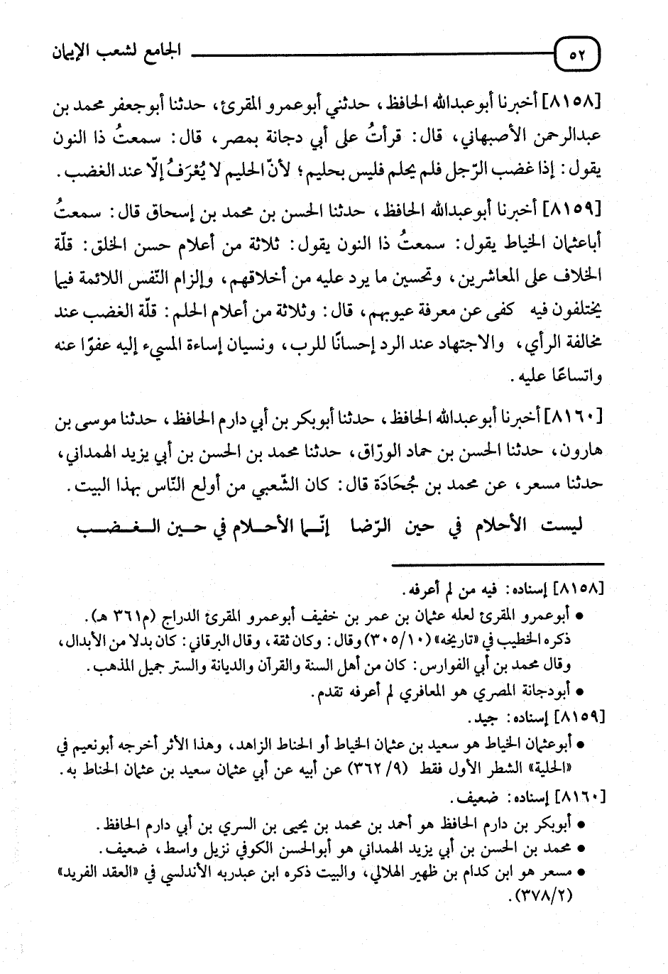 8158 - أَخْبَرَنَا أَبُو عَبْدِ اللهِ الْحَافِظُ، حَدَّثَنِي أَبُو عَمْرٍو الْمُقْرِئُ، نا أَبُو جَعْفَرٍ مُحَمَّدُ بْنُ عَبْدِ الرَّحْمَنِ الْأَصْبَهَانِيُّ، قَالَ: قَرَأْتُ عَلَى أَبِي دُجَانَةَ بِمِصْرَ، قَالَ: سَمِعْتُ ذَا النُّونِ، يَقُولُ: " §إِذَا غَضِبَ الرَّجُلُ فَلَمْ يَحْلُمْ فَلَيْسَ بِحَلِيمٍ، لِأَنَّ الْحَلِيمَ لَا يُعْرَفُ إِلَّا عِنْدَ الْغَضَبِ "