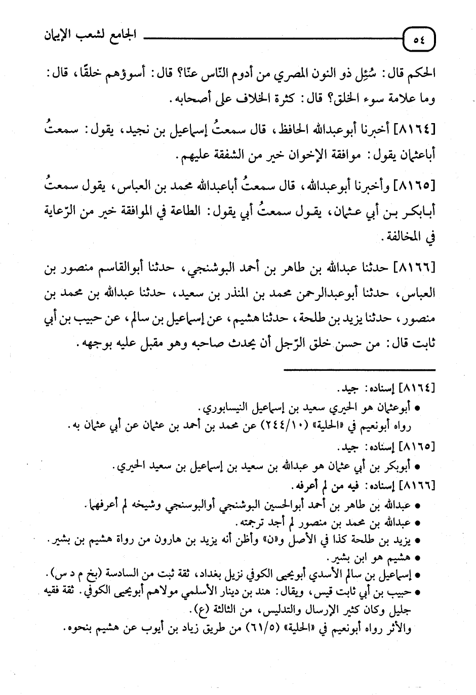 8166 - حَدَّثَنَا عَبْدُ اللهِ بْنُ طَاهِرِ بْنِ أَحْمَدَ الْبُوشَنْجِيُّ، نا أَبُو الْقَاسِمِ مَنْصُورُ بْنُ الْعَبَّاسِ، نا أَبُو عَبْدِ الرَّحْمَنِ مُحَمَّدُ بْنُ الْمُنْذِرِ بْنِ سَعِيدٍ، نا عَبْدُ اللهِ بْنُ مُحَمَّدِ بْنِ مَنْصُورٍ، نا يَزِيدُ بْنُ طَلْحَةَ، نا هُشَيْمٌ، عَنْ إِسْمَاعِيلَ، وَسَالِمٍ، عَنْ حَبِيبِ بْنِ أَبِي ثَابِتٍ، قَالَ: §" مِنْ حُسْنِ خُلُقِ الرَّجُلِ أَنْ يُحَدِّثَ صَاحِبَهُ وَهُوَ مُقْبِلٌ عَلَيْهِ بِوَجْهِهِ "