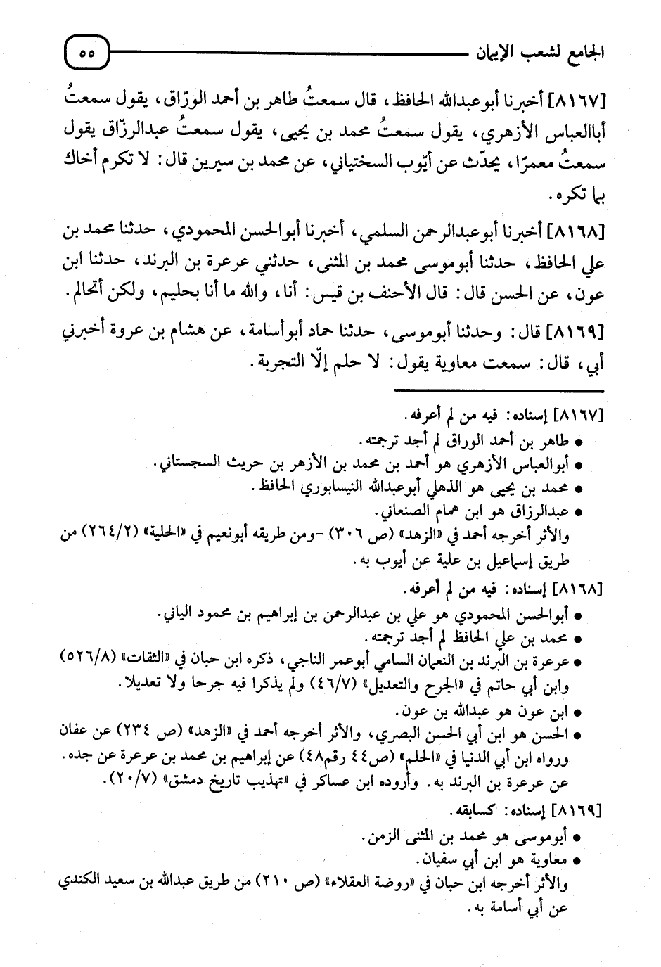 8168 - أَخْبَرَنَا أَبُو عَبْدِ الرَّحْمَنِ السُّلَمِيُّ، أنا أَبُو الْحَسَنِ الْمَحْمُودِيُّ، نا مُحَمَّدُ بْنُ عَلِيٍّ الْحَافِظُ، نا أَبُو مُوسَى مُحَمَّدُ بْنُ الْمُثَنَّى، حَدَّثَنِي عَرْعَرَةُ بْنُ الْبِرِنْدِ، نا ابْنُ عَوْنٍ، عَنِ الْحَسَنِ، قَالَ: قَالَ الْأَحْنَفُ بْنُ قَيْسٍ: " أَمَا وَاللهِ §مَا أَنَا بِحَلِيمٍ، وَلَكِنِّي أَتَحَالَمُ "