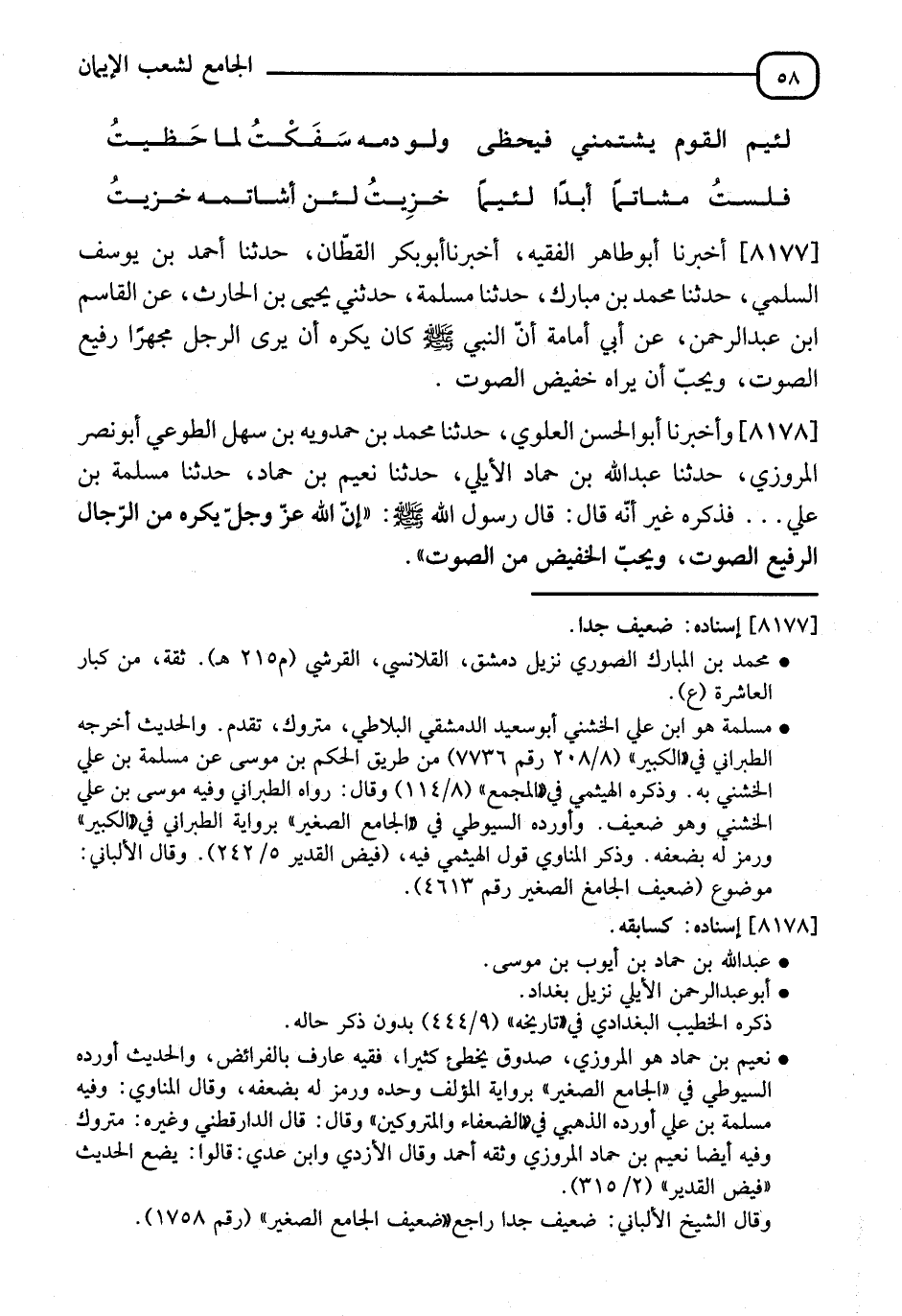 8178 - أَخْبَرَنَا عَبْدُ اللهِ بْنُ يُوسُفَ، نا عَبْدُ اللهِ بْنُ حَمَّادٍ الْأَيْلِيُّ، نا نُعَيْمُ بْنُ حَمَّادٍ، نا سَلَمَةُ بْنُ عَلِيٍّ، فَذَكَرَهُ، غَيْرَ أَنَّهُ قَالَ: قَالَ رَسُولُ اللهِ صَلَّى اللَّهُ عَلَيْهِ وَسَلَّمَ: " إِنَّ §اللهَ عَزَّ وَجَلَّ يَكْرَهُ مِنَ الرِّجَالِ الرَّفِيعَ الصَّوْتِ وَيُحِبُّ الْخَفِيضَ مِنَ الصَّوْتِ " -[59]- تَفَرَّدَ بِهِ سَلَمَةُ بْنُ عَلِيٍّ وَلَيْسَ بِالْقَوِيِّ
