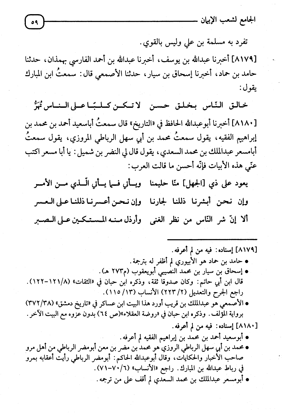 8179 - وَأَخْبَرَنَا أَبُو الْحَسَنِ الْعَلَوِيُّ، أنا مُحَمَّدُ بْنُ حَمْدَوَيْهِ بْنِ سَهْلٍ الْمُطَوِّعِيُّ أَبُو نَصْرٍ الْمَرْوَزِيُّ، نا عَبْدُ اللهِ بْنُ أَحْمَدَ الْفَارِسِيُّ بِهَمْدَانَ، نا حَامِدُ بْنُ حَمَّادٍ، نا إِسْحَاقُ بْنُ يَسَارٍ، نا الْأَصْمَعِيُّ، قَالَ: سَمِعْتُ ابْنُ الْمُبَارَكِ، يَقُولُ:"