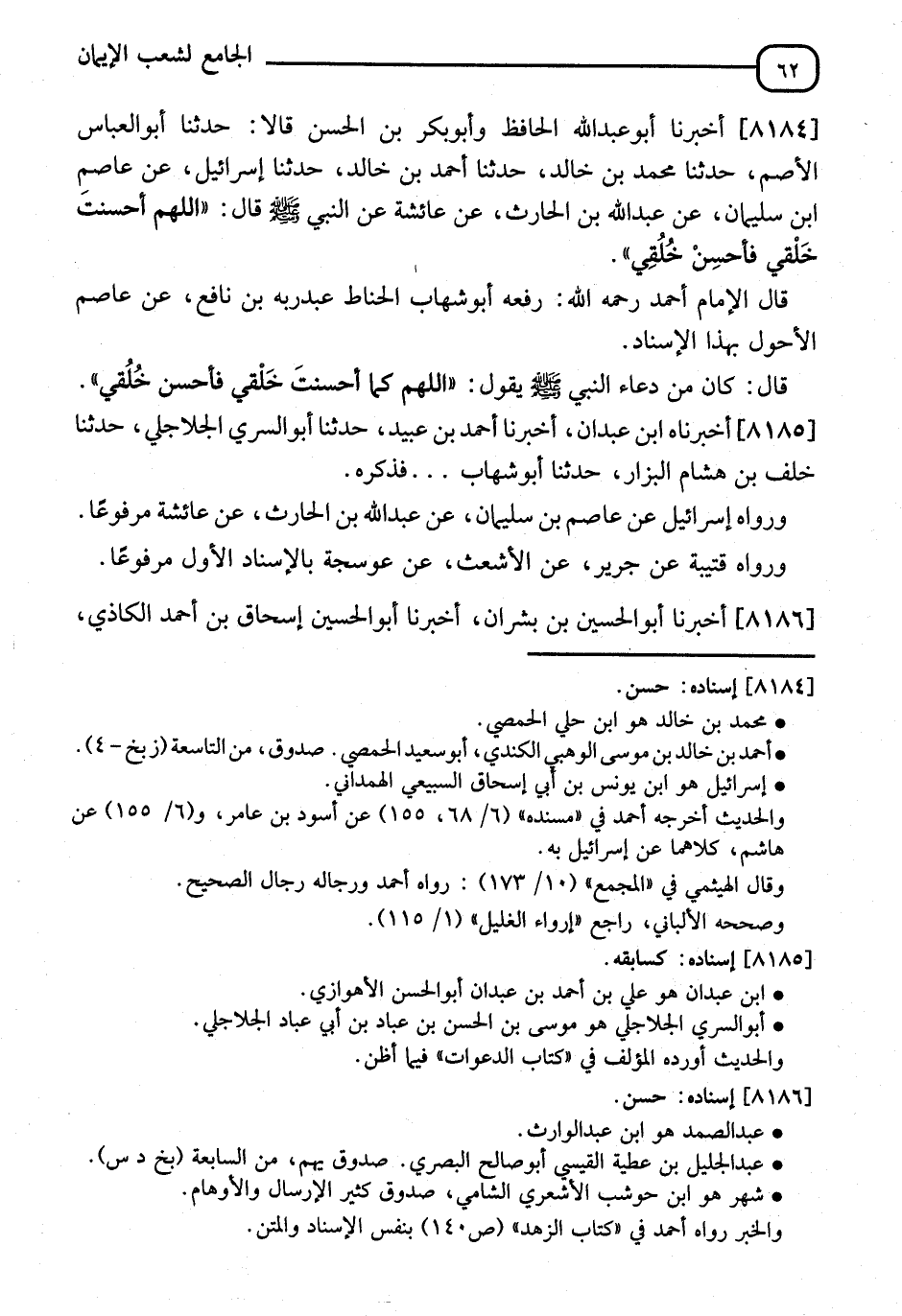 8184 - أَخْبَرَنَا أَبُو عَبْدِ اللهِ الْحَافِظُ، وَأَبُو بَكْرِ بْنُ الْحَسَنِ، قَالَا: نا أَبُو الْعَبَّاسِ الْأَصَمُّ، نا مُحَمَّدُ بْنُ خَالِدٍ، نا أَحْمَدُ بْنُ خَالِدٍ، نا إِسْرَائِيلُ، عَنْ عَاصِمِ بْنِ سُلَيْمَانَ، عَنْ عَبْدِ اللهِ بْنِ الْحَارِثِ، عَنْ عَائِشَةَ، عَنِ النَّبِيِّ صَلَّى اللَّهُ عَلَيْهِ وَسَلَّمَ، أَنَّهُ قَالَ: " §اللهُمَّ أَحْسَنْتَ خَلْقِي فَأَحْسِنْ خُلُقِي " قَالَ الْإِمَامُ أَحْمَدُ: وَرَفَعَهُ أَيْضًا أَبُو شِهَابٍ الْحَنَّاطُ عَبْدُ رَبِّهِ بْنُ نَافِعٍ، عَنْ عَاصِمٍ الْأَحْوَلِ بِهَذَا الْإِسْنَادِ، قَالَ: كَانَ مِنْ دُعَاءِ النَّبِيِّ صَلَّى اللَّهُ عَلَيْهِ وَسَلَّمَ يَقُولُ: " اللهُمَّ كَمَا حَسَّنْتَ خَلْقِي فَأَحْسِنْ خُلُقِي "