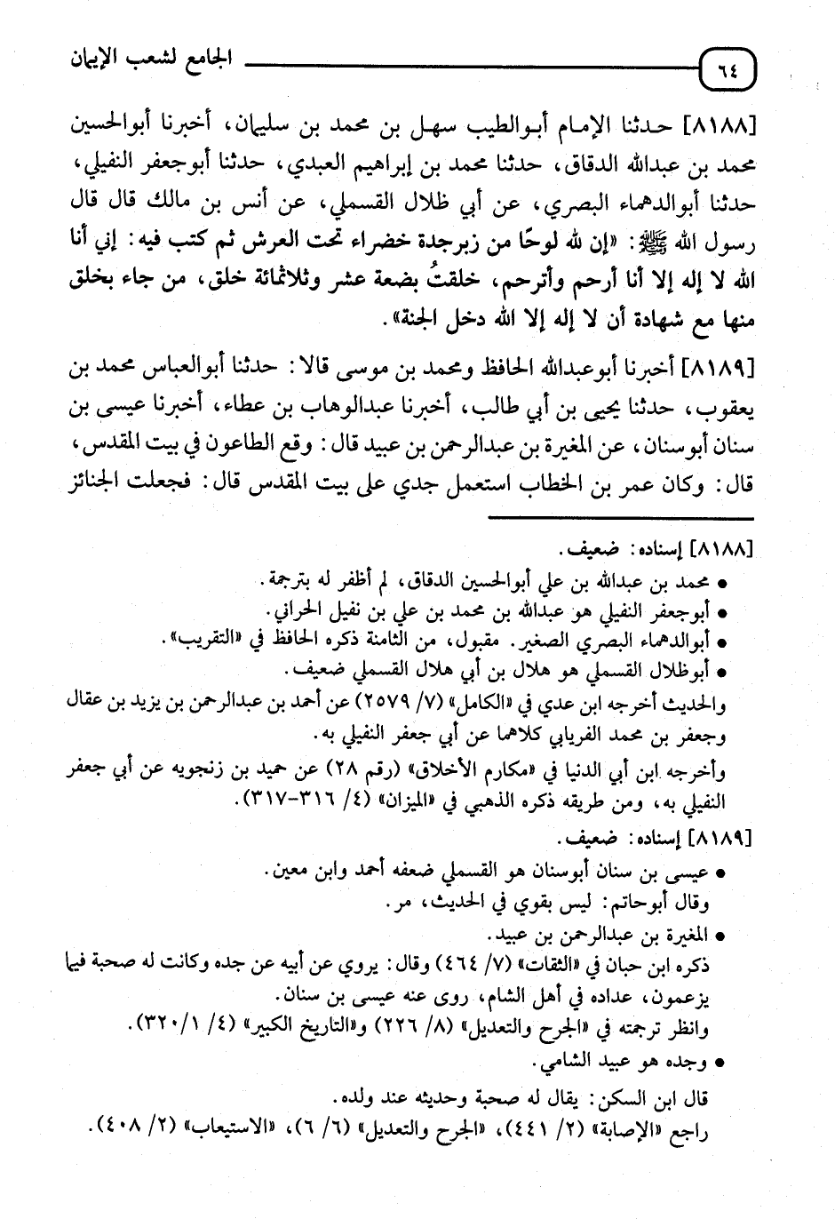 8189 - أَخْبَرَنَا أَبُو عَبْدِ اللهِ الْحَافِظُ، وَمُحَمَّدُ بْنُ مُوسَى، قَالَا: نا أَبُو الْعَبَّاسِ مُحَمَّدُ بْنُ يَعْقُوبَ، نا يَحْيَى بْنُ أَبِي طَالِبٍ، أنا عَبْدُ الْوَهَّابِ بْنُ عَطَاءٍ، أنا عِيسَى بْنُ سِنَانٍ أَبُو سِنَانٍ، عَنِ الْمُغِيرَةِ بْنِ عَبْدِ الرَّحْمَنِ بْنِ عُبَيْدٍ، قَالَ: وَقَعَ الطَّاعُونُ فِي بَيْتِ الْمَقْدِسِ، قَالَ: وَكَانَ عُمَرُ بْنُ الْخَطَّابِ اسْتَعْمَلَ جَدِّي عَلَى بَيْتِ الْمَقْدِسِ، قَالَ: فَجَعَلَتِ الْجَنَائِزُ -[65]- تُنْقَلُ وَجَدِّي يُصَلِّي عَلَيْهَا، وَجَعَلَ لَا يَحْمِلُهُنَّ إِلَّا الشَّبَابُ أَصْحَابُ التَّعَبُّدِ وَالْحَمَّامِ، قَالَ: فَقُلْتُ: أَصْلَحَكَ اللهُ، هَلْ تَرْجُو لِهَؤُلَاءِ شَيْئًا؟ قَالَ: يَا بُنَيَّ، أُحَدِّثُكَ عَنِ الثِّقَةِ أَنَّ §الْإِسْلَامَ وُضِعَ عَلَى ثَلَاثِمِائَةٍ وَثَلَاثَةٍ وَثَلَاثِينَ شَرِيعَةً، لِكُلِّ عُضْوٍ مِنِ ابْنِ آدَمَ شَرِيعَةٌ، فَمَنْ جَاءَ بِوَاحِدَةٍ مِنْهُنَّ مُخْلِصًا دَخَلَ الْجَنَّةَ "، قَالَ: ثُمَّ قَرَأَ {إِنَّ اللهَ لَا يَظْلِمُ مِثْقَالَ ذَرَّةٍ وَإِنْ تَكُ حَسَنَةً يُضَاعِفْهَا وَيُؤْتِ مِنْ لَدُنْهُ أَجْرًا عَظِيمًا} [النساء: 40] "
