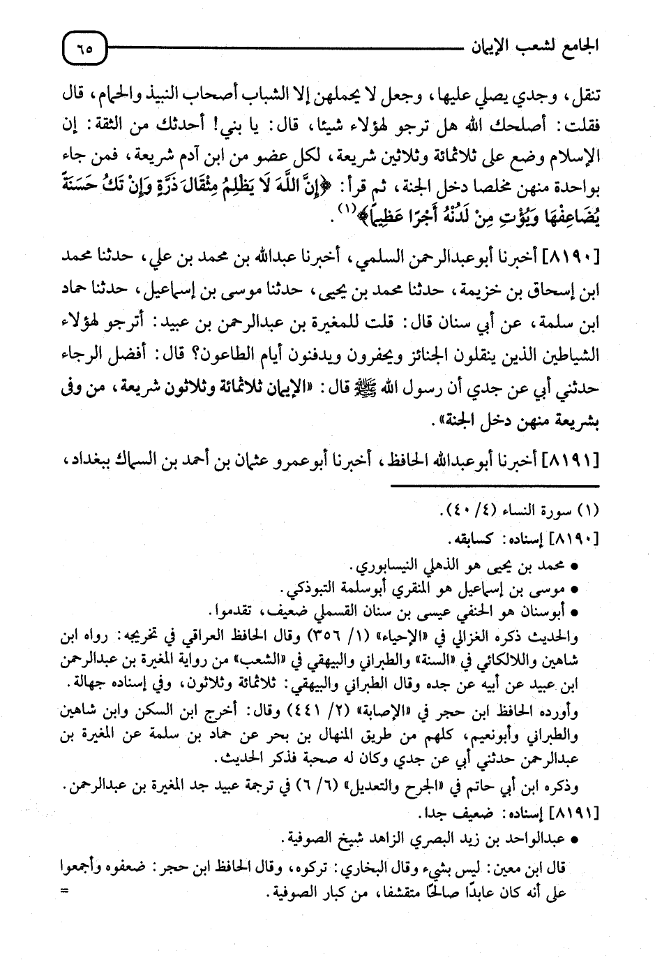8190 - أَخْبَرَنَا أَبُو عَبْدِ الرَّحْمَنِ السُّلَمِيُّ، أنا عَبْدُ اللهِ بْنُ مُحَمَّدِ بْنِ عَلِيٍّ، نا مُحَمَّدُ بْنُ إِسْحَاقَ بْنِ خُزَيْمَةَ، نا مُحَمَّدُ بْنُ يَحْيَى، نا مُوسَى بْنُ إِسْمَاعِيلَ، نا حَمَّادُ بْنُ سَلَمَةَ، عَنْ أَبِي سِنَانٍ، قَالَ: قُلْتُ لِلْمُغِيرَةِ بْنِ عَبْدِ الرَّحْمَنِ بْنِ عُبَيْدٍ: أَتَرْجُو لِهَؤُلَاءِ الشُّطَّارِ الَّذِينَ يَنْقِلُونَ الْجَنَائِزَ وَيَحْفِرُونَ وَيَدْفِنُونَ أَيَّامَ الطَّاعُونِ؟ قَالَ: أَفْضَلَ الرَّجَاءِ، حَدَّثَنِي أَبِي، عَنْ جَدِّي، أَنَّ رَسُولَ اللهِ صَلَّى اللَّهُ عَلَيْهِ وَسَلَّمَ، قَالَ: " §الْإِيمَانُ ثَلَاثُمِائَةٍ وَثَلَاثَةٌ وَثَلَاثُونَ شَرِيعَةً، مَنْ وَفَى بِشَرِيعَةٍ مِنْهُنَّ دَخَلَ الْجَنَّةَ "
