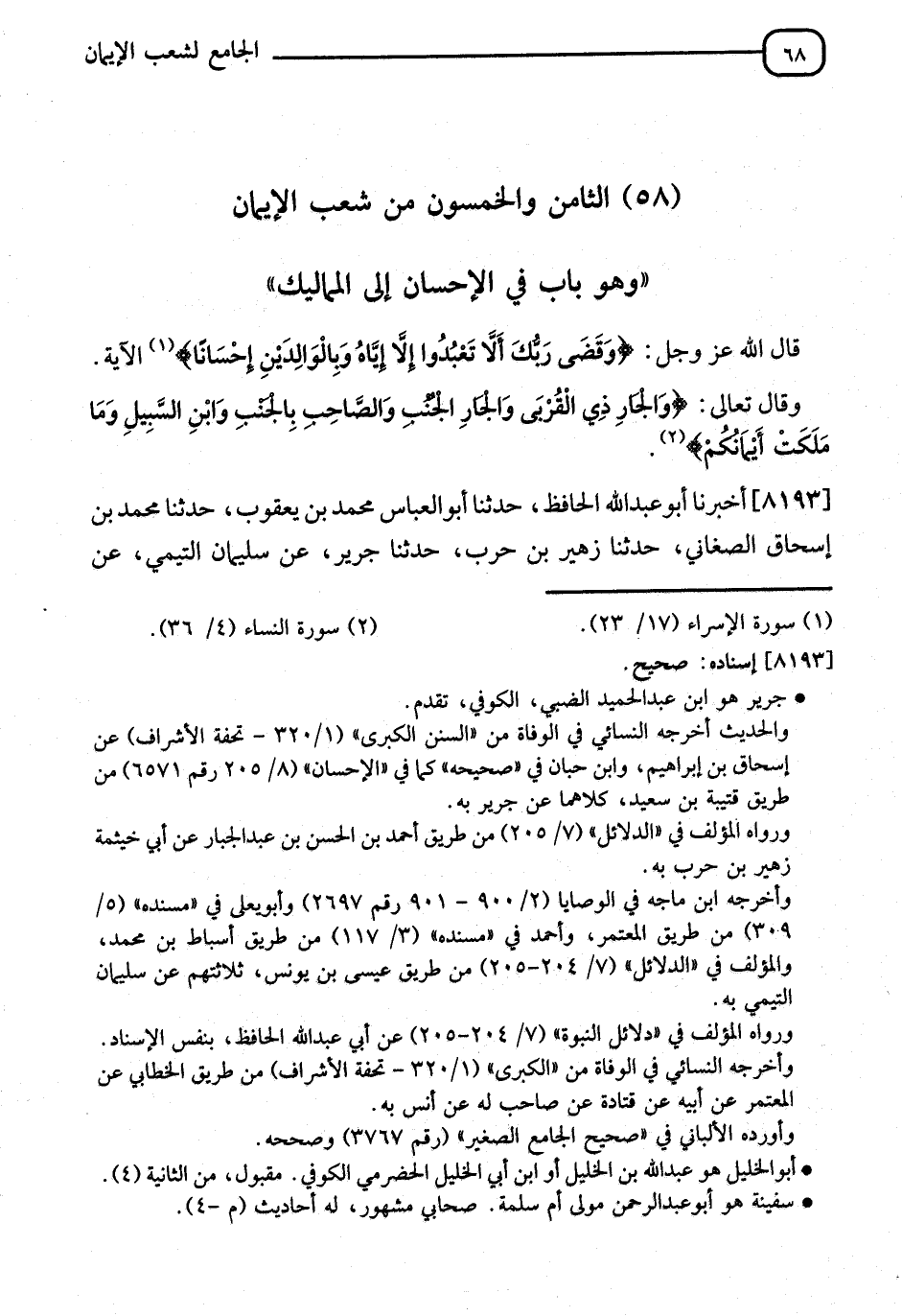 §الثَّامِنُ وَالْخَمْسُونَ مِنْ شُعَبِ الْإِيمَانِ وَهُوَ بَابٌ فِي الْإِحْسَانِ إِلَى الْمَمَالِيكِ قَالَ اللهُ عَزَّ وَجَلَّ: {وَقَضَى رَبُّكَ أَلَّا تَعْبُدُوا إِلَّا إِيَّاهُ وَبِالْوَالِدَيْنِ إِحْسَانًا} [الإسراء: 23] وَقَالَ تَعَالَى: {وَاعْبُدُوا اللهَ وَلَا تُشْرِكُوا بِهِ شَيْئًا وَبِالْوَالِدَيْنِ إِحْسَانًا وَبِذِي الْقُرْبَى وَالْيَتَامَى وَالْمَسَاكِينِ وَالْجَارِ ذِي الْقُرْبَى وَالْجَارِ الْجُنُبِ وَالصَّاحِبِ بِالْجَنْبِ وَابْنِ السَّبِيلِ وَمَا مَلَكَتْ أَيْمَانُكُمْ} [النساء: 36]