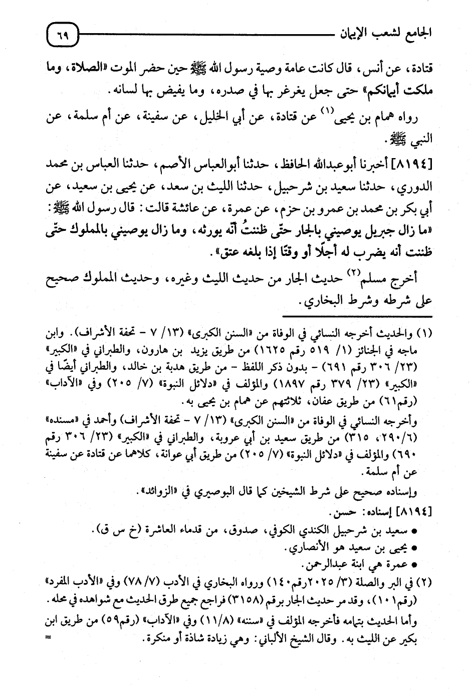 8194 - أَخْبَرَنَا أَبُو عَبْدِ اللهِ الْحَافِظُ، نا أَبُو الْعَبَّاسِ الْأَصَمُّ، نا الْعَبَّاسُ بْنُ مُحَمَّدٍ الدُّورِيُّ، نا سَعِيدُ بْنُ شُرَحْبِيلَ، نا اللَّيْثُ بْنُ سَعْدٍ، عَنْ يَحْيَى بْنِ سَعِيدٍ، عَنْ أَبِي بَكْرِ بْنِ مُحَمَّدِ بْنِ عَمْرِو بْنِ حَزْمٍ، عَنْ عَمْرَةَ، عَنْ عَائِشَةَ، قَالَتْ: قَالَ رَسُولُ اللهِ صَلَّى اللَّهُ عَلَيْهِ وَسَلَّمَ: " §مَا زَالَ جِبْرِيلُ يُوصِينِي بِالْجَارِ حَتَّى ظَنَنْتُ أَنَّهُ يُوَرِّثُهُ، وَمَا زَالَ يُوصِينِي بِالْمَمْلُوكِ حَتَّى ظَنَنْتُ أَنَّهُ يَضْرِبُ لَهُ أَجَلًا أَوْ وَقْتًا إِذَا بَلَغَهُ أُعْتِقَ " أَخْرَجَ مُسْلِمٌ حَدِيثَ الْجَارِ مِنْ حَدِيثِ اللَّيْثِ وَغَيْرِهِ، وَحَدِيثَ الْمَمْلُوكِ صَحِيحٌ عَلَى شَرْطِهِ وَشَرْطِ الْبُخَارِيِّ