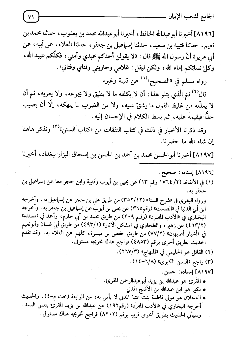 8196 - أَخْبَرَنَا أَبُو عَبْدِ اللهِ الْحَافِظُ، أنا أَبُو عَبْدِ اللهِ مُحَمَّدُ بْنُ يَعْقُوبَ، نا مُحَمَّدُ بْنُ نُعَيْمٍ، نا قُتَيْبَةُ بْنُ سَعِيدٍ، نا إِسْمَاعِيلُ بْنُ جَعْفَرٍ، نا الْعَلَاءُ، عَنْ أَبِيهِ، عَنْ أَبِي هُرَيْرَةَ، أَنَّ رَسُولَ اللهِ صَلَّى اللَّهُ عَلَيْهِ وَسَلَّمَ، قَالَ: " §لَا يَقُولَنَّ أَحَدُكُمْ: عَبْدِي وَأَمَتِي، فَكُلُّكُمْ عَبِيدُ اللهِ، وَكُلُّ نِسَائِكُمْ إِمَاءُ اللهِ، وَلَكِنْ لِيَقُلْ: غُلَامِي، وَجَارِيَتِي، وَفَتَاتِي، وَفَتَايَ " رَوَاهُ مُسْلِمٌ فِي الصَّحِيحِ عَنْ قُتَيْبَةَ، وَغَيْرِهِ قَالَ: ثُمَّ الَّذِي يَتْلُو هَذَا أَنْ لَا يُكَلِّفَهُ مَا لَا يُطِيقُ وَلَا يُجَوِّعَهُ، وَلَا يُعْرِيهِ، ثُمَّ أَنْ لَا يُعَذِّبَهُ مِنْ غَلِيظٍ بِمَا يَشُقُّ عَلَيْهِ، وَلَا مِنَ الضَّرْبِ بِمَا يُنْهِكُهُ إِلَّا أَنْ يُصِيبَ حَدًّا فَيُقِيمَهُ عَلَيْهِ، ثُمَّ بَسْطَ الْكَلَامَ فِي الْإِحْسَانِ إِلَيْهِ، وَقَدْ ذَكَرْنَا الْأَخْبَارَ فِي ذَلِكَ فِي كِتَابِ النَّفَقَاتِ مِنْ كِتَابِ السُّنَنِ، وَنَذْكُرُ ههُنَا إِنْ شَاءَ اللهُ مَا حَضَرْنَا