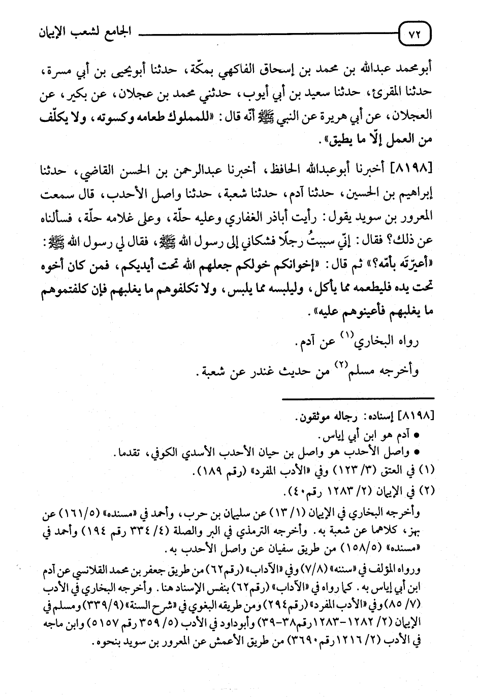 8198 - أَخْبَرَنَا أَبُو عَبْدِ اللهِ الْحَافِظُ، أنا أَبُو عَبْدِ الرَّحْمَنِ بْنُ الْحَسَنِ الْقَاضِي، نا إِبْرَاهِيمُ بْنُ الْحُسَيْنِ، نا آدَمُ، نا شُعْبَةُ، نا وَاصِلٌ الْأَحْدَبُ، قَالَ: سَمِعْتُ الْمَعْرُورَ بْنَ سُوَيْدٍ، يَقُولُ: رَأَيْتُ أَبَا ذَرٍّ الْغِفَارِيَّ وَعَلَيْهِ حُلَّةٌ وَعَلَى غُلَامِهِ حُلَّةٌ، فَسَأَلْنَاهُ عَنْ ذَلِكَ؟ فَقَالَ: إِنِّي سَابَبْتُ رَجُلًا فَشَكَانِي إِلَى رَسُولِ اللهِ صَلَّى اللَّهُ عَلَيْهِ وَسَلَّمَ، فَقَالَ لِي رَسُولُ اللهِ صَلَّى اللَّهُ عَلَيْهِ وَسَلَّمَ: " أَعَيَّرْتَهُ بِأُمِّهِ "؟ ثُمَّ قَالَ: " إِنَّ §إِخْوَانَكُمْ خَوَلُكُمْ، جَعَلَهُمُ اللهُ تَحْتَ أَيْدِيكُمْ، فَمَنْ كَانَ أَخُوهُ تَحْتَ يَدِهِ فَلْيُطْعِمْهُ مِمَّا يَأْكُلُ، وَلْيُلْبِسْهُ مِمَّا يَلْبَسُ، وَلَا تُكَلِّفُوهُمْ مَا يَغْلِبُهُمْ، فَإِنْ كَلَّفْتُمُوهُمْ مَا يَغْلِبُهُمْ فَأَعِينُوهُمْ عَلَيْهِ " رَوَاهُ الْبُخَارِيُّ، عَنْ آدَمَ، وَأَخْرَجَهُ مُسْلِمٌ، مِنْ حَدِيثِ غُنْدَرٍ، عَنْ شُعْبَةَ