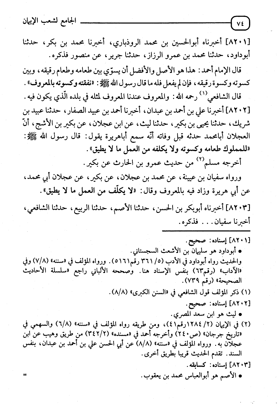 8202 - أَخْبَرَنَا عَلِيُّ بْنُ أَحْمَدَ بْنِ عَبْدَانَ، أنا أَحْمَدُ بْنُ عُبَيْدٍ الصَّفَّارُ، نا عُبَيْدُ بْنُ شَرِيكٍ، نا يَحْيَى بْنُ بُكَيْرٍ، نا لَيْثٌ، عَنِ ابْنِ عَجْلَانَ، عَنْ بُكَيْرِ بْنِ الْأَشَجِّ، أَنَّ الْعَجْلَانَ أَبَا مُحَمَّدٍ حَدَّثَهُ قَبْلَ وَفَاتِهِ، أَنَّهُ سَمِعَ أَبَا هُرَيْرَةَ، يَقُولُ: قَالَ رَسُولُ اللهِ صَلَّى اللَّهُ عَلَيْهِ وَسَلَّمَ: §" لِلْمَمْلُوكِ طَعَامُهُ وَكُسْوَتُهُ بِالْمَعْرُوفِ وَلَا يُكَلِّفْهُ مِنَ الْعَمَلِ مَا لَا يُطِيقُ " أَخْرَجَهُ مُسْلِمٌ مِنْ حَدِيثِ عَمْرِو بْنِ الْحَارِثِ، عَنْ بُكَيْرٍ وَرَوَاهُ سُفْيَانُ بْنُ عُيَيْنَةَ، عَنْ مُحَمَّدِ بْنِ عَجْلَانَ، عَنْ بُكَيْرٍ، عَنْ عَجْلَانَ أَبِي مُحَمَّدٍ، عَنْ أَبِي هُرَيْرَةَ وَزَادَ فِيهِ: " بِالْمَعْرُوفِ "، وَقَالَ: " وَلَا يُكَلَّفْ مِنَ الْعَمَلِ إِلَّا مَا يُطِيقُ "،