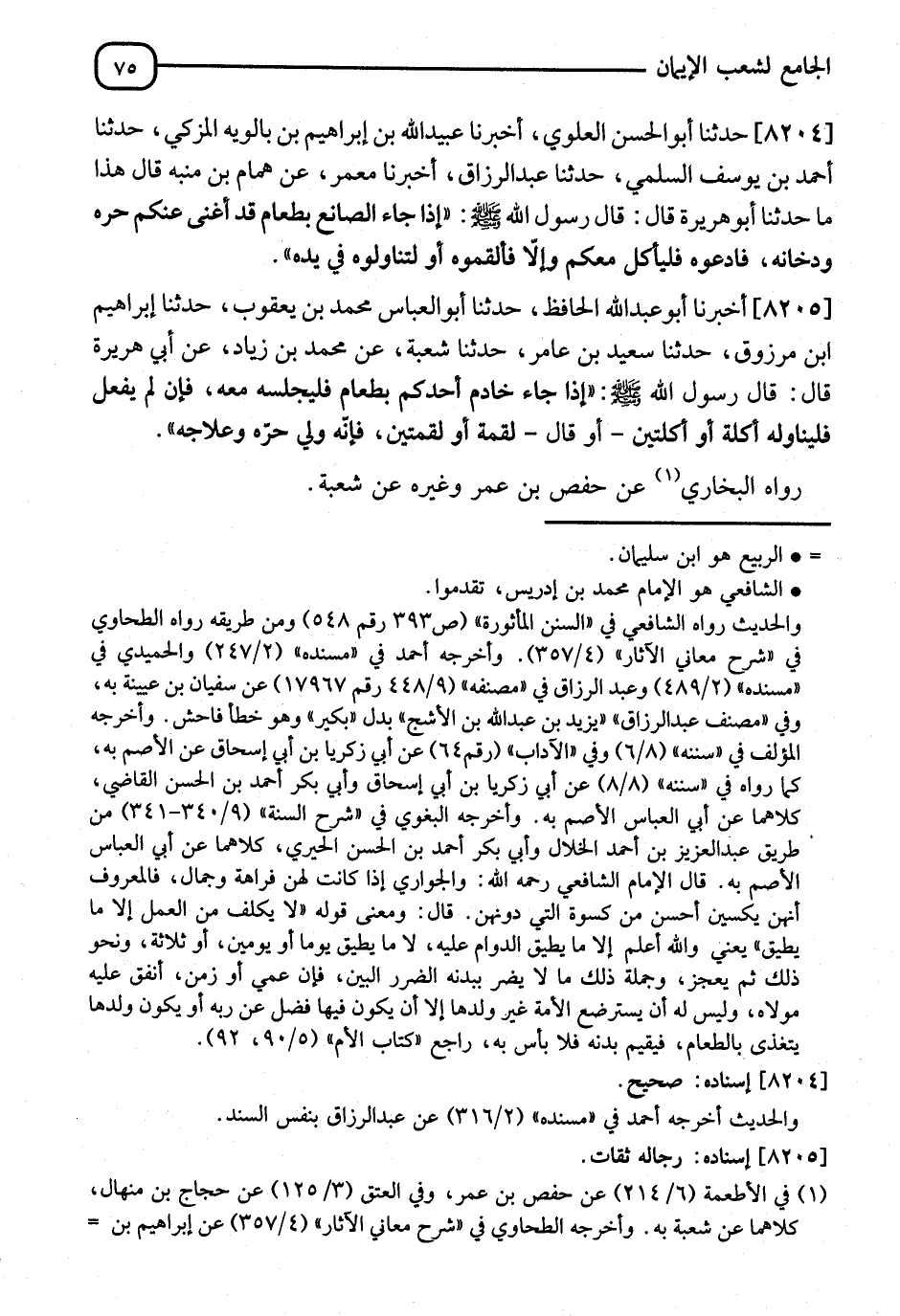 8205 - أَخْبَرَنَا أَبُو عَبْدِ اللهِ الْحَافِظُ، نا أَبُو الْعَبَّاسِ مُحَمَّدُ بْنُ يَعْقُوبَ، نا إِبْرَاهِيمُ بْنُ مَرْزُوقٍ، نا سَعِيدُ بْنُ عَامِرٍ، نا شُعْبَةُ، عَنْ مُحَمَّدِ بْنِ زِيَادٍ، عَنْ أَبِي هُرَيْرَةَ، قَالَ: قَالَ رَسُولُ اللهِ صَلَّى اللَّهُ عَلَيْهِ وَسَلَّمَ: " §إِذَا جَاءَ خَادِمُ أَحَدِكُمْ بِطَعَامٍ فَلْيُجْلِسْهُ مَعَهُ، فَإِنْ لَمْ يَفْعَلْ فَلْيُنَاوِلْهُ أَكْلَةً أَوْ أُكْلَتَيْنِ " أَوْ قَالَ: " لُقْمَةً أَوْ لُقْمَتَيْنِ، فَإِنَّهُ وَلِيُّ حَرِّهِ وَعِلَاجِهِ " رَوَاهُ الْبُخَارِيُّ عَنْ حَفْصِ بْنِ عُمَرَ، وَغَيْرِهِ، عَنْ شُعْبَةَ