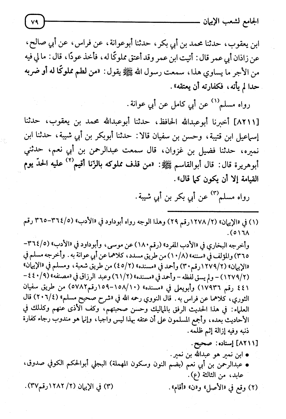 8211 - أَخْبَرَنَا أَبُو عَبْدِ اللهِ الْحَافِظُ، نا أَبُو عَبْدِ اللهِ مُحَمَّدُ بْنُ يَعْقُوبَ، نا إِسْمَاعِيلُ بْنُ قُتَيْبَةَ، وَحَسَنُ بْنُ سُفْيَانَ، قَالَا: نا أَبُو بَكْرِ بْنُ أَبِي شَيْبَةَ، نا ابْنُ نُمَيْرٍ، نا فُضَيْلُ بْنُ غَزْوَانَ، قَالَ: سَمِعْتُ عَبْدَ الرَّحْمَنِ بْنَ أَبِي نَعَمٍ، حَدَّثَنِي أَبُو هُرَيْرَةَ، قَالَ: قَالَ أَبُو الْقَاسِمِ صَلَّى اللَّهُ عَلَيْهِ وَسَلَّمَ: " §مَنْ قَذَفَ مَمْلُوكَهُ بِالزِّنَا أَقَامَ عَلَيْهِ الْحَدَّ يَوْمَ الْقِيَامَةِ، إِلَّا أَنْ يَكُونَ كَمَا قَالَ " رَوَاهُ مُسْلِمٌ، عَنْ أَبِي بَكْرِ بْنِ أَبِي شَيْبَةَ، -[80]- وَأَخْرَجَهُ الْبُخَارِيُّ مِنْ حَدِيثِ يَحْيَى الْقَطَّانِ، عَنْ فُضَيْلِ بْنِ غَزْوَانَ