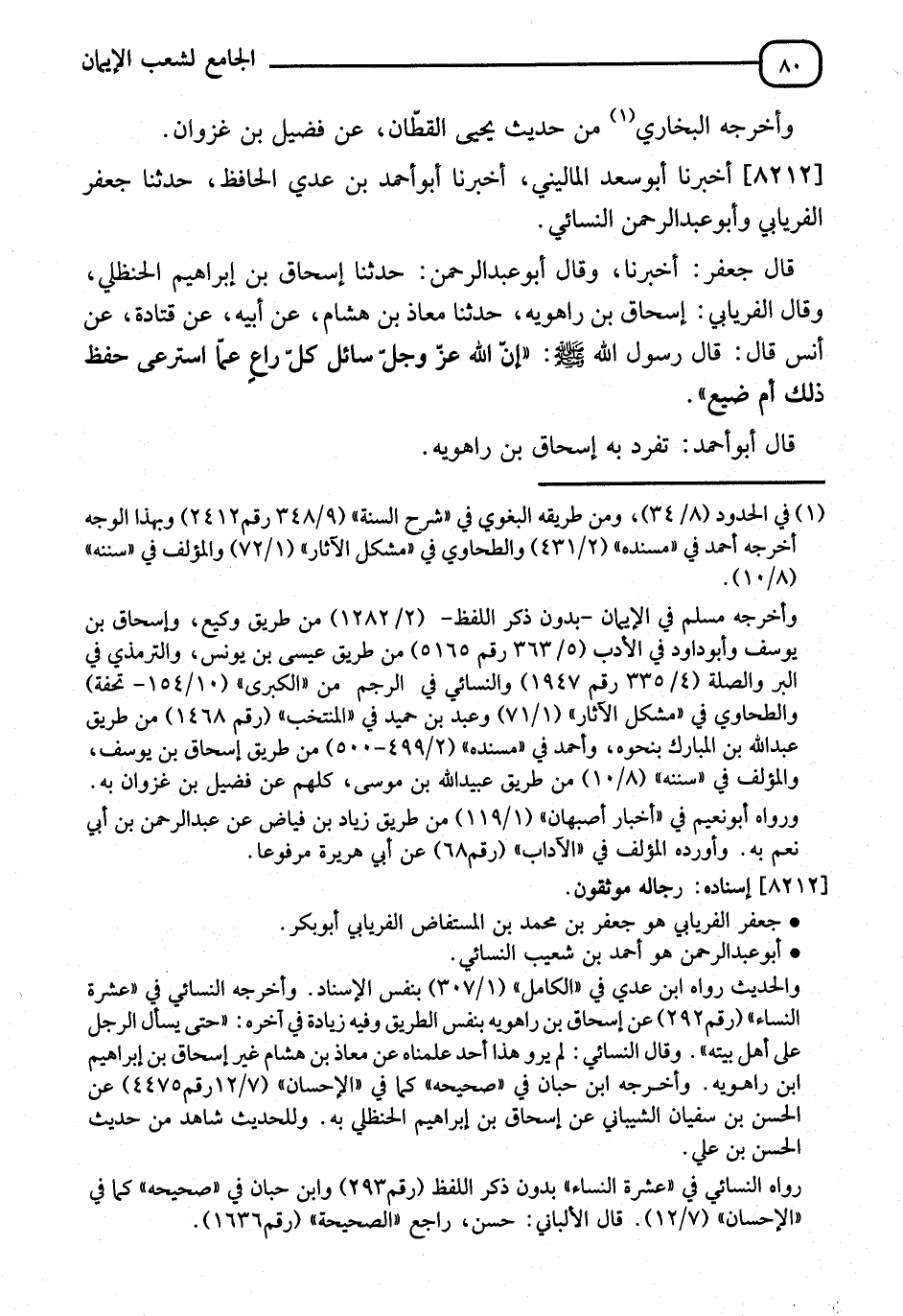 8212 - أَخْبَرَنَا أَبُو سَعْدٍ الْمَالِينِيُّ، أنا أَبُو أَحْمَدَ بْنُ عَدِيٍّ الْحَافِظُ، نا جَعْفَرٌ الْفِرْيَابِيُّ، وَأَبُو عَبْدِ الرَّحْمَنِ النَّسَائِيُّ، قَالَ جَعْفَرٌ: نا، وَقَالَ أَبُو عَبْدِ الرَّحْمَنِ، أنا إِسْحَاقُ بْنُ إِبْرَاهِيمَ الْحَنْظَلِيُّ، وَقَالَ الْفِرْيَابِيُّ إِسْحَاقُ بْنُ رَاهَوَيْهِ، أنا مُعَاذُ بْنُ هِشَامٍ، عَنْ أَبِيهِ، عَنْ قَتَادَةَ، عَنْ أَنَسٍ، قَالَ: قَالَ رَسُولُ اللهِ صَلَّى اللَّهُ عَلَيْهِ وَسَلَّمَ: " إِنَّ §اللهَ عَزَّ وَجَلَّ سَائِلٌ كُلَّ رَاعٍ عَمَّا اسْتُرْعِيَ حِفِظَ ذَلِكَ أَمْ ضَيَّعَ " قَالَ أَبُو أَحْمَدَ: " تَفَرَّدَ بِهِ إِسْحَاقُ بْنُ رَاهَوَيْهِ "