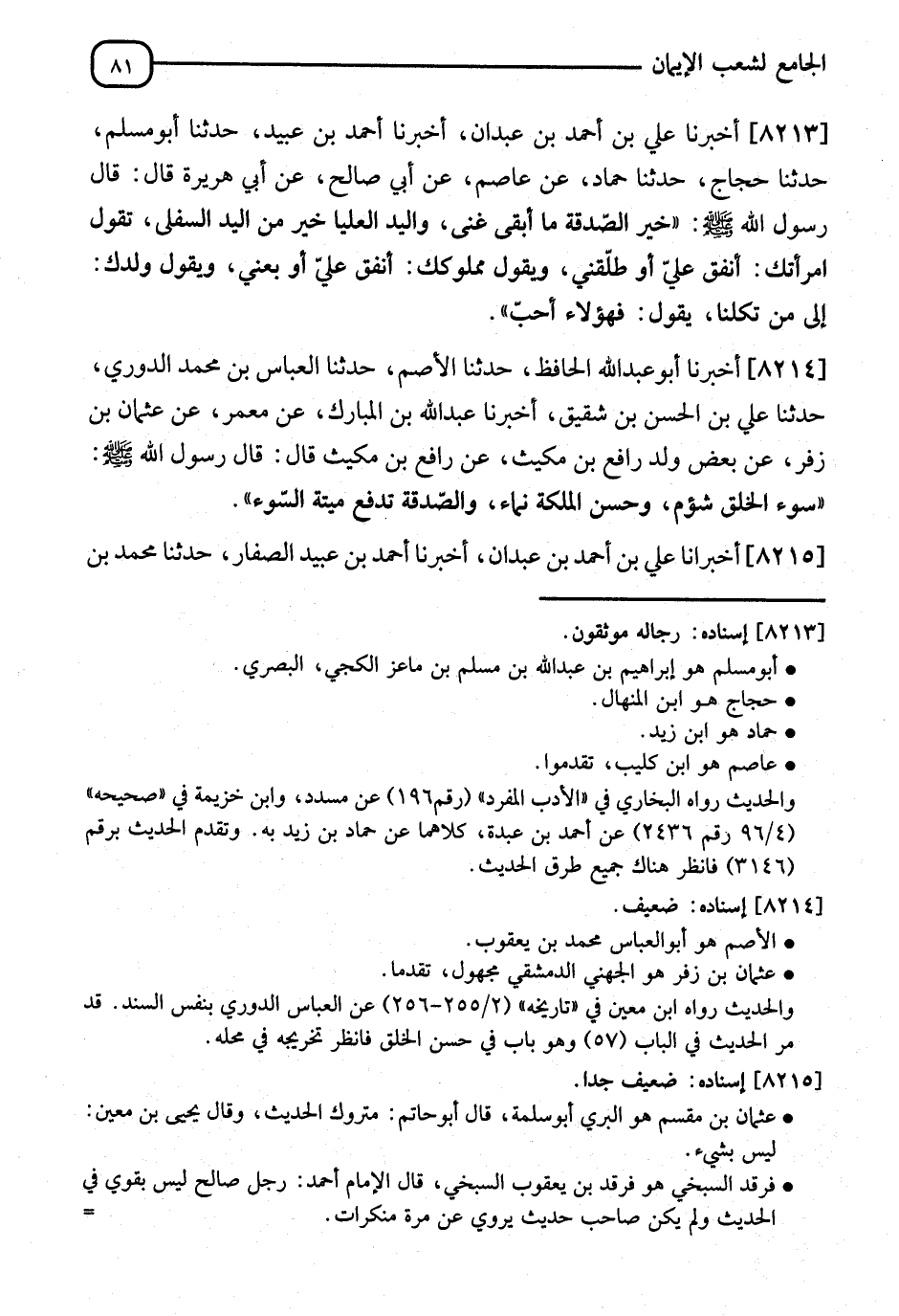 8213 - أَخْبَرَنَا عَلِيُّ بْنُ أَحْمَدَ بْنِ عَبْدَانَ، أنا أَحْمَدُ بْنُ عُبَيْدٍ، نا أَبُو مُسْلِمٍ، نا حَجَّاجٌ، نا حَمَّادٌ، عَنْ عَاصِمٍ، عَنْ أَبِي صَالِحٍ، عَنْ أَبِي هُرَيْرَةَ، قَالَ: قَالَ رَسُولُ اللهِ صَلَّى اللَّهُ عَلَيْهِ وَسَلَّمَ: " §خَيْرُ الصَّدَقَةِ مَا أَبْقَى غَنِيً، وَالْيَدُ الْعُلْيَا خَيْرٌ مِنَ الْيَدِ السُّفْلَى " تَقُولُ امْرَأَتِكَ: أَنْفِقْ عَلَيَّ أَوْ طَلِّقْنِي، وَيَقُولُ مَمْلُوكُكَ: أَنْفِقْ عَلَيَّ أَوْ بِعْنِي، وَيَقُولُ وَلَدُكَ: إِلَى مَنْ تَكِلُنَا، يَقُولُ: فَهَؤُلَاءِ أَحَبُّ "