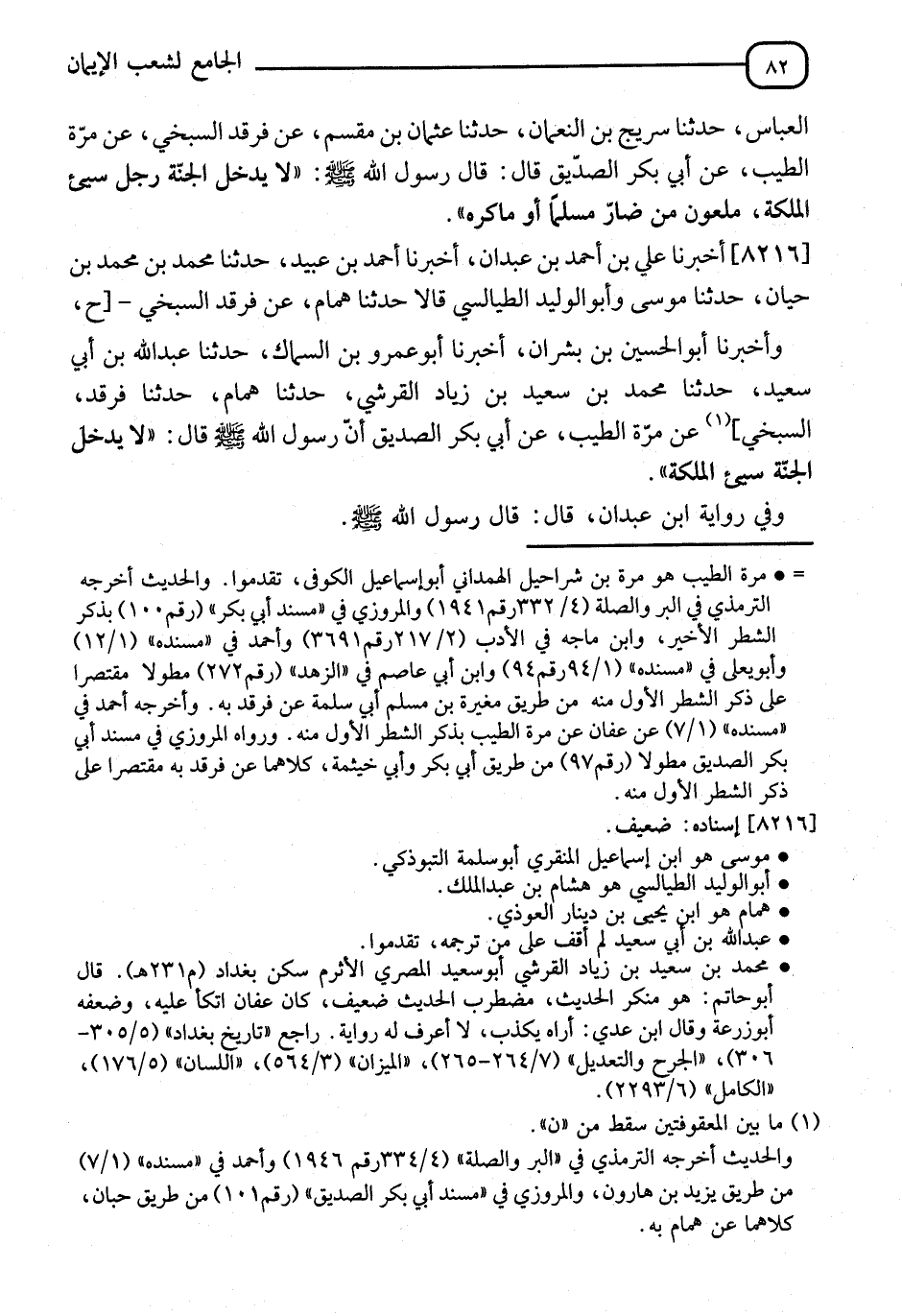 8216 - أَخْبَرَنَا عَلِيُّ بْنُ أَحْمَدَ بْنِ عَبْدَانَ، أنا أَحْمَدُ بْنُ عُبَيْدٍ، نا مُحَمَّدُ بْنُ مُحَمَّدِ بْنِ حَيَّانَ، نا مُوسَى، وَأَبُو الْوَلِيدِ الطَّيَالِسِيُّ، قَالَا: نا هَمَّامٌ، عَنْ فَرْقَدٍ السَّبَخِيِّ، ح وَأَخْبَرَنَا أَبُو الْحُسَيْنِ بْنُ بِشْرَانَ، أنا أَبُو عَمْرِو بْنُ السَّمَّاكِ، نا عَبْدُ اللهِ بْنُ أَبِي سَعِيدٍ، نا مُحَمَّدُ بْنُ سَعِيدِ بْنِ زِيَادٍ الْقُرَشِيُّ، نا هَمَّامٌ، نا فَرْقَدٌ السَّبَخِيُّ، عَنْ مُرَّةَ الطَّيِّبِ، عَنْ أَبِي بَكْرٍ الصِّدِّيقِ، أَنَّ رَسُولَ اللهِ صَلَّى اللَّهُ عَلَيْهِ وَسَلَّمَ قَالَ: §" لَا يَدْخُلُ الْجَنَّةَ سَيِّءُ الْمَلَكَةِ " وَفِي رِوَايَةِ ابْنِ عَبْدَانَ، قَالَ: قَالَ رَسُولُ اللهِ صَلَّى اللَّهُ عَلَيْهِ وَسَلَّمَ