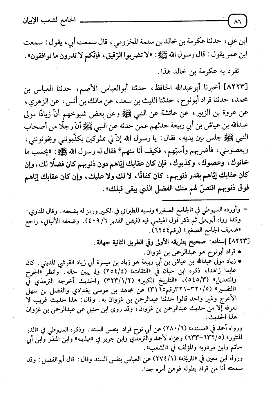 8223 - أَخْبَرَنَا أَبُو عَبْدِ اللهِ الْحَافِظُ، نا أَبُو الْعَبَّاسِ الْأَصَمُّ، نا الْعَبَّاسُ بْنُ مُحَمَّدٍ، نا قُرَادٌ أَبُو نُوحٍ، نا اللَّيْثُ بْنُ سَعْدٍ، عَنْ مَالِكِ بْنِ أَنَسٍ، عَنِ الزُّهْرِيِّ، عَنْ عُرْوَةَ بْنِ الزُّبَيْرِ، عَنْ عَائِشَةَ، عَنِ النَّبِيِّ صَلَّى اللَّهُ عَلَيْهِ وَسَلَّمَ، وَعَنْ بَعْضِ شُيُوخِهِمْ، أَنَّ زِيَادًا مَوْلَى عَبْدِ اللهِ بْنِ عَيَّاشِ بْنِ أَبِي رَبِيعَةَ حَدَّثَهُمْ، عَمَّنْ حَدَّثَهُ، عَنِ النَّبِيِّ صَلَّى اللَّهُ عَلَيْهِ وَسَلَّمَ أَنَّ رَجُلًا مِنْ أَصْحَابِ النَّبِيِّ صَلَّى اللَّهُ عَلَيْهِ وَسَلَّمَ جَلِيسٌ بَيْنَ يَدَيْهِ، فَقَالَ: يَا رَسُولَ اللهِ، إِنَّ لِي مَمْلُوكِينَ يُكَذِّبُونَنِي وَيَخُونَنِي وَيَعْصُونَنِي، فَأَضْرِبُهُمْ وَأَسُبُّهُمْ، فَكَيْفَ أَنَا مِنْهُمْ؟ فَقَالَ رَسُولُ اللهِ صَلَّى اللَّهُ عَلَيْهِ وَسَلَّمَ: " §بِحَسْبِ مَا خَانُوكَ وَعَصَوْكَ وَكَذَّبُوكَ، فَإِنْ كَانَ عِقَابُكَ إِيَّاهُمْ دُونَ ذُنُوبِهِمْ كَانَ فَضْلًا لَكَ، وَإِنْ كَانَ عِقَابُكَ إِيَّاهُمْ بِقَدْرِ ذُنُوبِهِمْ كَانَ كَفَافًا لَا لَكَ وَلَا عَلَيْكَ، وَإِنْ كَانَ عِقَابُكَ إِيَّاهُمْ فَوْقَ ذُنُوبِهِمْ اقْتَصَّ لَهُمْ مِنْكَ الْفَضْلَ الَّذِي يَبْقَى قِبَلَكَ "، -[87]- فَجَعَلَ الرَّجُلُ يَبْكِي بَيْنَ يَدَيْ رَسُولِ اللهِ صَلَّى اللَّهُ عَلَيْهِ وَسَلَّمَ وَيَهْتِفُ، فَقَالَ رَسُولُ اللهِ صَلَّى اللَّهُ عَلَيْهِ وَسَلَّمَ: " مَا لَهُ؟ أَمَا تَقْرَأُ كِتَابَ اللهِ تَعَالَى: {وَنَضَعُ الْمَوَازِينَ الْقِسْطَ لِيَوْمِ الْقِيَامَةِ فَلَا تُظْلَمُ نَفْسٌ شَيْئًا وَإِنْ كَانَ مِثْقَالَ حَبَّةٍ مِنْ خَرْدَلٍ أَتَيْنَا بِهَا وَكَفَى بِنَا حَاسِبِينَ} [الأنبياء: 47] "، فَقَالَ الرَّجُلُ: يَا رَسُولَ اللهِ، مَا أَجِدُ شَيْئًا خَيْرًا لِي مِنْ فِرَاقِ هَؤُلَاءِ، أُشْهِدُكَ أَنَّهُمْ أَحْرَارٌ كُلُّهُمْ "، هَذَا الْمَتْنُ شَبِيهٌ بِالْإِسْنَادِ الثَّانِي غَيْرُ شَبِيهٍ بِالْإِسْنَادِ الْأَوَّلِ، تَفَرَّدَ بِهِ قُرَادٌ، وَيُشْبِهُ أَنْ يَكُونَ غَلَطًا مِنْ بَعْضِ الْكُتَّابِ