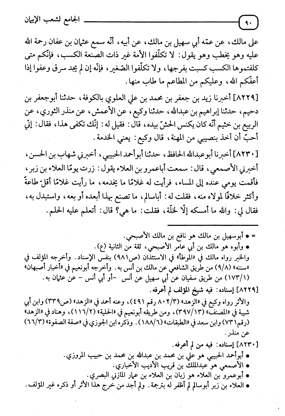 8230 - أَخْبَرَنَا أَبُو عَبْدِ اللهِ الْحَافِظُ، أنا أَبُو أَحْمَدَ الْحَبِيبِيُّ، أَخْبَرَنِي شِهَابُ بْنُ الْحُسَيْنِ، أَخْبَرَنِي الْأَصْمَعِيُّ، قَالَ: سَمِعْتُ أَبَا عَمْرِو بْنَ الْعَلَاءِ، يَقُولُ: زُرْتُ يَوْمًا الْعَلَاءَ بْنَ زَيْدٍ فَأَقَمْتُ يَوْمِي عِنْدَهُ إِلَى الْمَسَاءِ، فَرَأَيْتُ لَهُ غُلَامًا يَخْدُمُهُ، مَا رَأَيْتُ غُلَامًا أَقَلَّ طَاعَةً وَأَكْثَرَ خِلَافًا لِمَوْلَاهُ مِنْهُ، فَقُلْتُ لَهُ: " أَبَا سَالِمٍ، §تَصْنَعُ بِهَذَا أَبْعِدْهُ أَوْ بِعْهُ وَاسْتَبْدِلْ بِهِ "، فَقَالَ لِي: وَاللهِ مَا أَمْسِكُهُ إِلَّا لِخَلَّةٍ، قُلْتُ لَهُ: " وَمَا هِيَ؟ " قَالَ: أَتَعَلَّمُ عَلَيْهِ الْحِلْمَ "