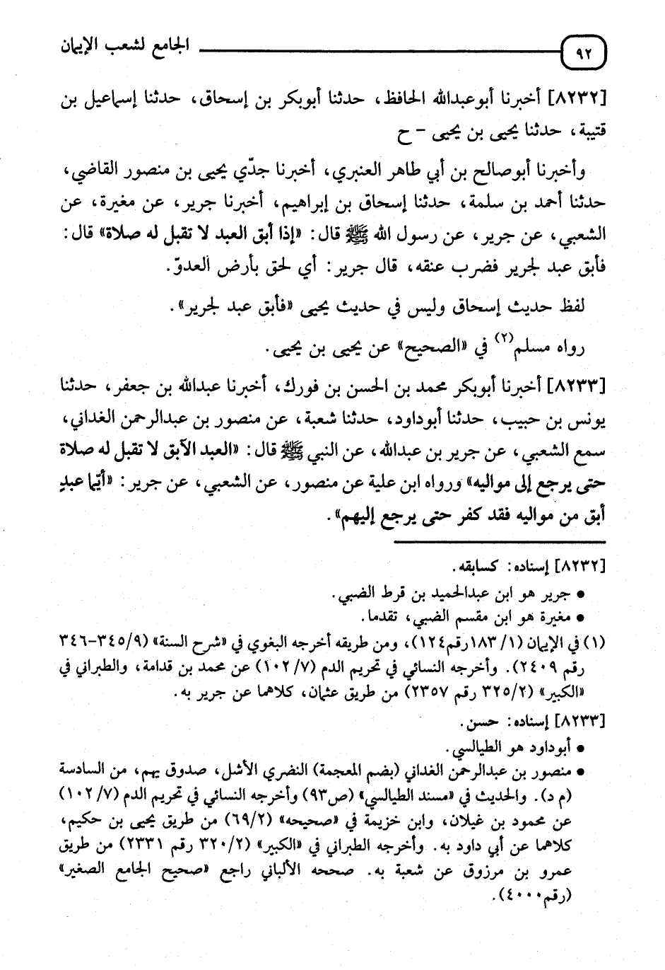 8232 - أَخْبَرَنَا أَبُو عَبْدِ اللهِ الْحَافِظُ، نا أَبُو بَكْرِ بْنُ إِسْحَاقَ، نا إِسْمَاعِيلُ بْنُ قُتَيْبَةَ، نا يَحْيَى بْنُ يَحْيَى، ح، وَأَخْبَرَنَا أَبُو صَالِحِ بْنُ أَبِي طَاهِرٍ الْعَنْبَرِيُّ، أنا جَدِّي يَحْيَى بْنُ مَنْصُورٍ الْقَاضِي، نا أَحْمَدُ بْنُ سَلَمَةَ، نا إِسْحَاقُ بْنُ إِبْرَاهِيمَ، أنا جِيرَةُ، عَنْ مُغِيرَةَ، عَنِ الشَّعْبِيِّ، عَنْ جَرِيرٍ، عَنْ رَسُولِ اللهِ صَلَّى اللَّهُ عَلَيْهِ وَسَلَّمَ، قَالَ: " §إِذَا أَبَقَ الْعَبْدُ لَمْ تُقْبَلْ لَهُ صَلَاةٌ "، قَالَ: فَأَبَقَ عَبْدٌ لِجَرِيرٍ فَضَرَبَ عُنُقَهُ، قَالَ جَرِيرٌ: أَيْ لَحِقَ بِأَرْضِ الْعَدُوِّ، لَفْظُ حَدِيثِ إِسْحَاقَ، وَلَيْسَ فِي حَدِيثِ يَحْيَى: فَأَبَقَ عَبْدٌ لِجَرِيرٍ، رَوَاهُ مُسْلِمٌ فِي الصَّحِيحِ، عَنْ يَحْيَى بْنِ يَحْيَى
