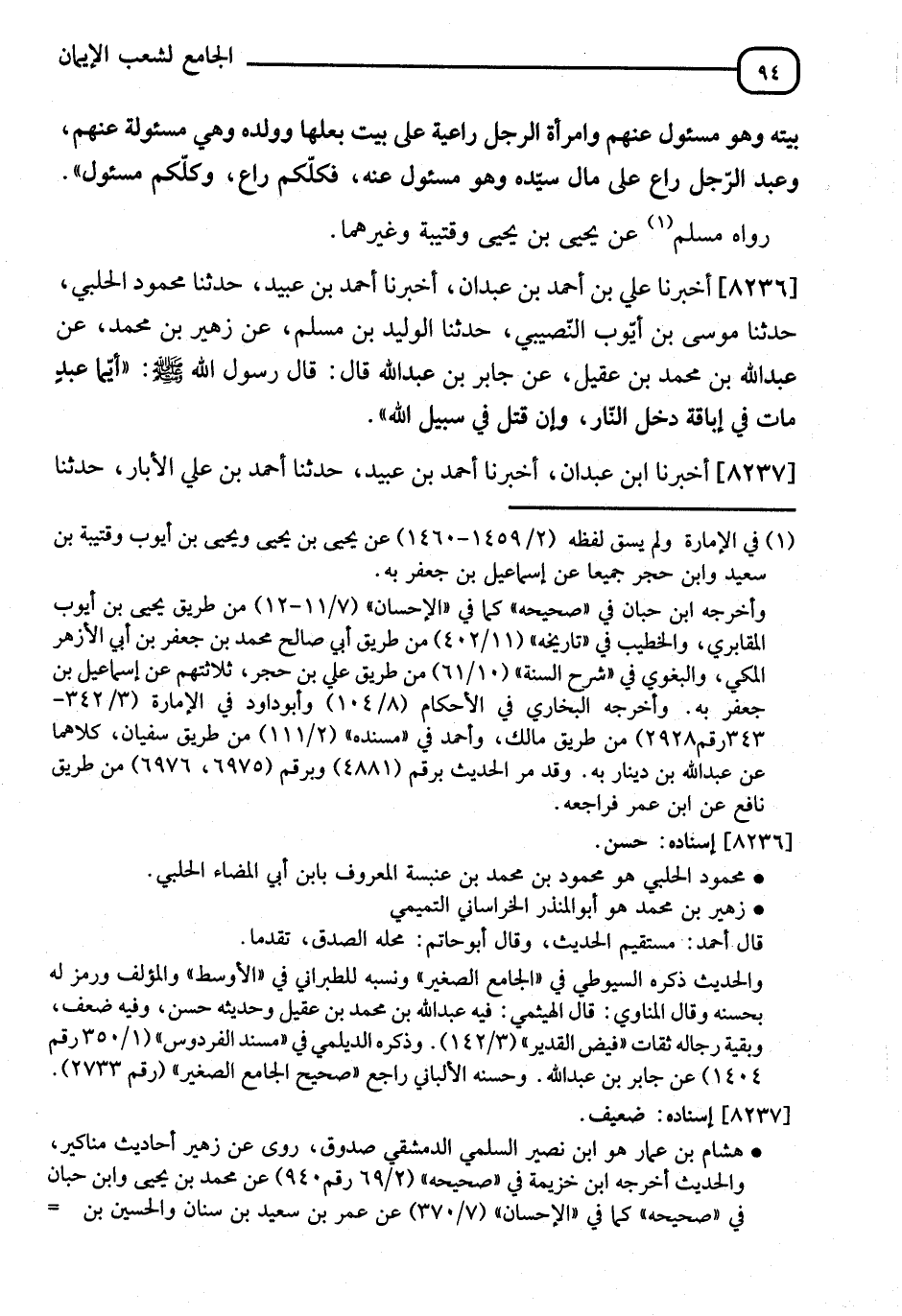 8236 - أَخْبَرَنَا عَلِيُّ بْنُ أَحْمَدَ بْنِ عَبْدَانَ، أنا أَحْمَدُ بْنُ عُبَيْدٍ، نا مَحْمُودٌ الْحَلَبِيُّ، نا مُوسَى بْنُ أَيُّوبَ النَّصِيبِيُّ، نا الْوَلِيدُ بْنُ مُسْلِمٌ، عَنْ زُهَيْرِ بْنِ مُحَمَّدِ بْنِ عَبْدِ اللهِ بْنِ مُحَمَّدِ بْنِ عُقَيْلٍ، عَنْ جَرِيرِ بْنِ عَبْدِ اللهِ، قَالَ: قَالَ رَسُولُ اللهِ صَلَّى اللَّهُ عَلَيْهِ وَسَلَّمَ: " §أَيُّمَا عَبْدٍ مَاتَ فِي إِبَاقَةٍ دَخَلَ النَّارَ، وَإِنْ قُتِلَ فِي سَبِيلِ اللهِ "