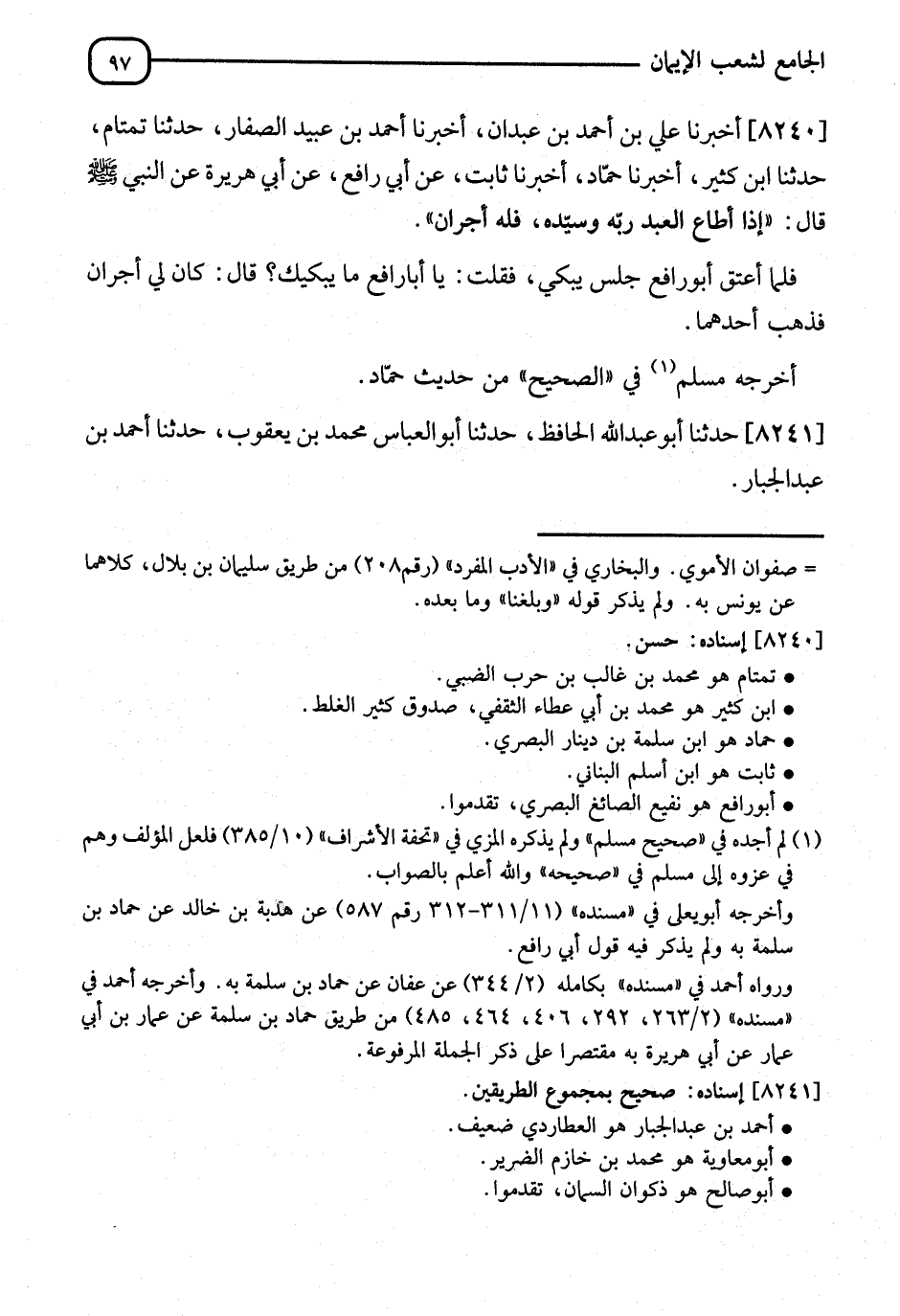 8240 - أَخْبَرَنَا عَلِيُّ بْنُ أَحْمَدَ بْنِ عَبْدَانَ، أنا أَحْمَدُ بْنُ عُبَيْدٍ الصَّفَّارُ، نا تَمْتَامٌ، نا ابْنُ كَثِيرٍ، أنا حَمَّادٌ، أنا ثَابِتٌ، عَنْ أَبِي رَافِعٍ، عَنْ أَبِي هُرَيْرَةَ، عَنِ النَّبِيِّ صَلَّى اللَّهُ عَلَيْهِ وَسَلَّمَ، قَالَ: " §إِذَا أَطَاعَ الْعَبْدُ رَبَّهُ وَسَيِّدَهُ فَلَهُ أَجْرَانِ "، فَلَمَّا أُعْتِقَ أَبُو رَافِعٍ جَلَسَ يَبْكِي، فَقُلْتُ: يَا أَبَا رَافِعٍ مَا يُبْكِيكَ؟ قَالَ: كَانَ لِي أَجْرَانِ، فَذَهَبَ أَحَدُهُمَا، أَخْرَجَهُ مُسْلِمٌ فِي الصَّحِيحِ، مِنْ حَدِيثِ حَمَّادٍ