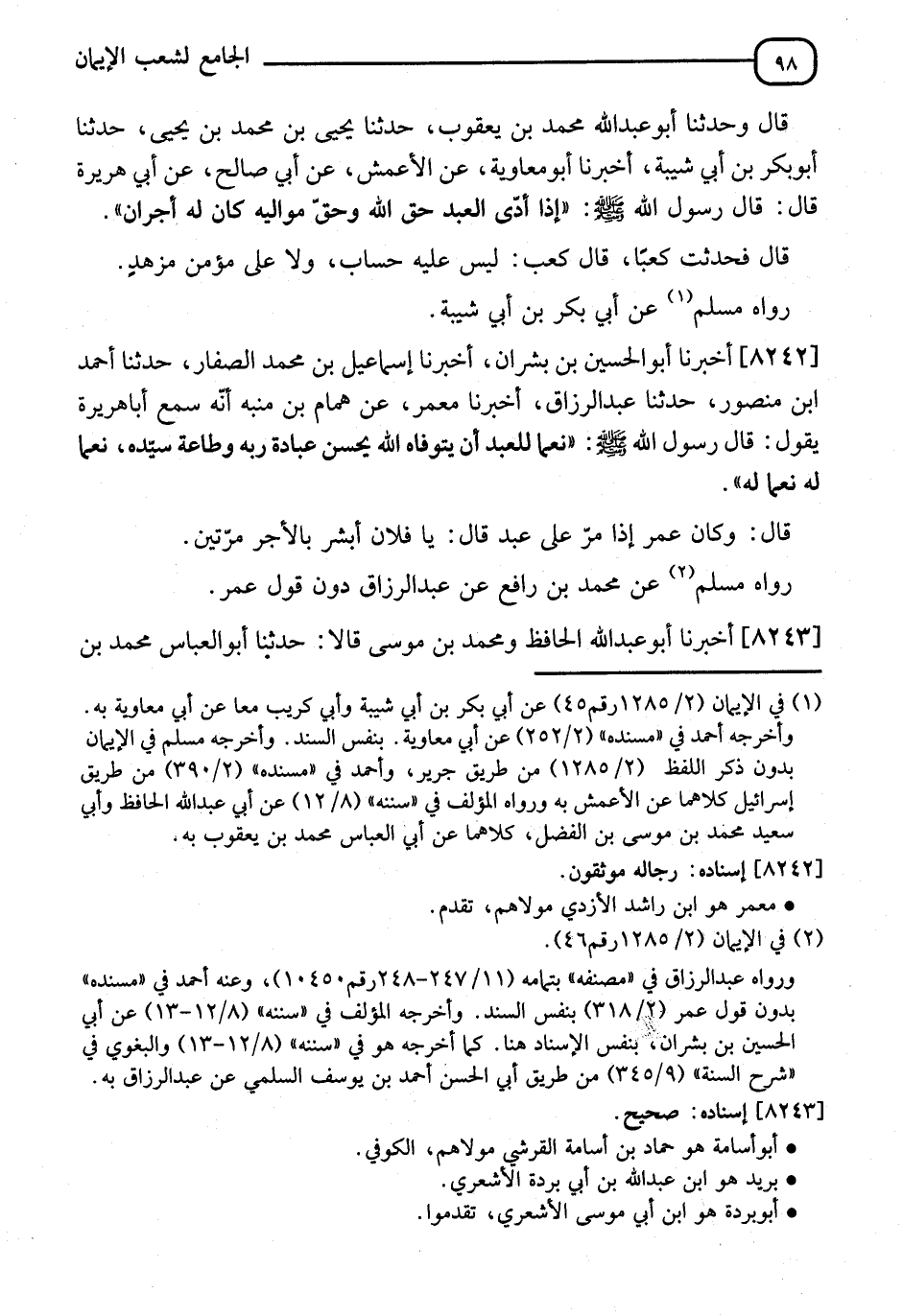 8242 - أَخْبَرَنَا أَبُو الْحُسَيْنِ بْنُ بِشْرَانَ، أنا إِسْمَاعِيلُ بْنُ مُحَمَّدٍ الصَّفَّارُ، نا أَحْمَدُ بْنُ مَنْصُورٍ، نا عَبْدُ الرَّزَّاقِ، أنا مَعْمَرٌ، عَنْ هَمَّامِ بْنِ مُنَبِّهٍ، أَنَّهُ سَمِعَ أَبَا هُرَيْرَةَ يَقُولُ: قَالَ رَسُولُ اللهِ صَلَّى اللَّهُ عَلَيْهِ وَسَلَّمَ: §" نِعِمَّا لِلْعَبْدِ أَنْ يَتَوَفَّاهُ اللهُ بِحُسْنِ عِبَادَةِ رَبِّهِ وَطَاعَةِ سَيِّدِهِ، نِعِمَّا لَهُ، نِعِمَّا لَهُ " قَالَ: وَكَانَ عُمَرُ إِذَا مَرَّ عَلَى عَبْدٍ قَالَ: " يَا فُلَانُ، أَبْشِرْ بِالْأَجْرِ مَرَّتَيْنِ ". رَوَاهُ مُسْلِمٌ، عَنْ مُحَمَّدِ بْنِ رَافِعٍ، عَنْ عَبْدِ الرَّزَّاقِ، دُونَ قَوْلِ عُمَرَ