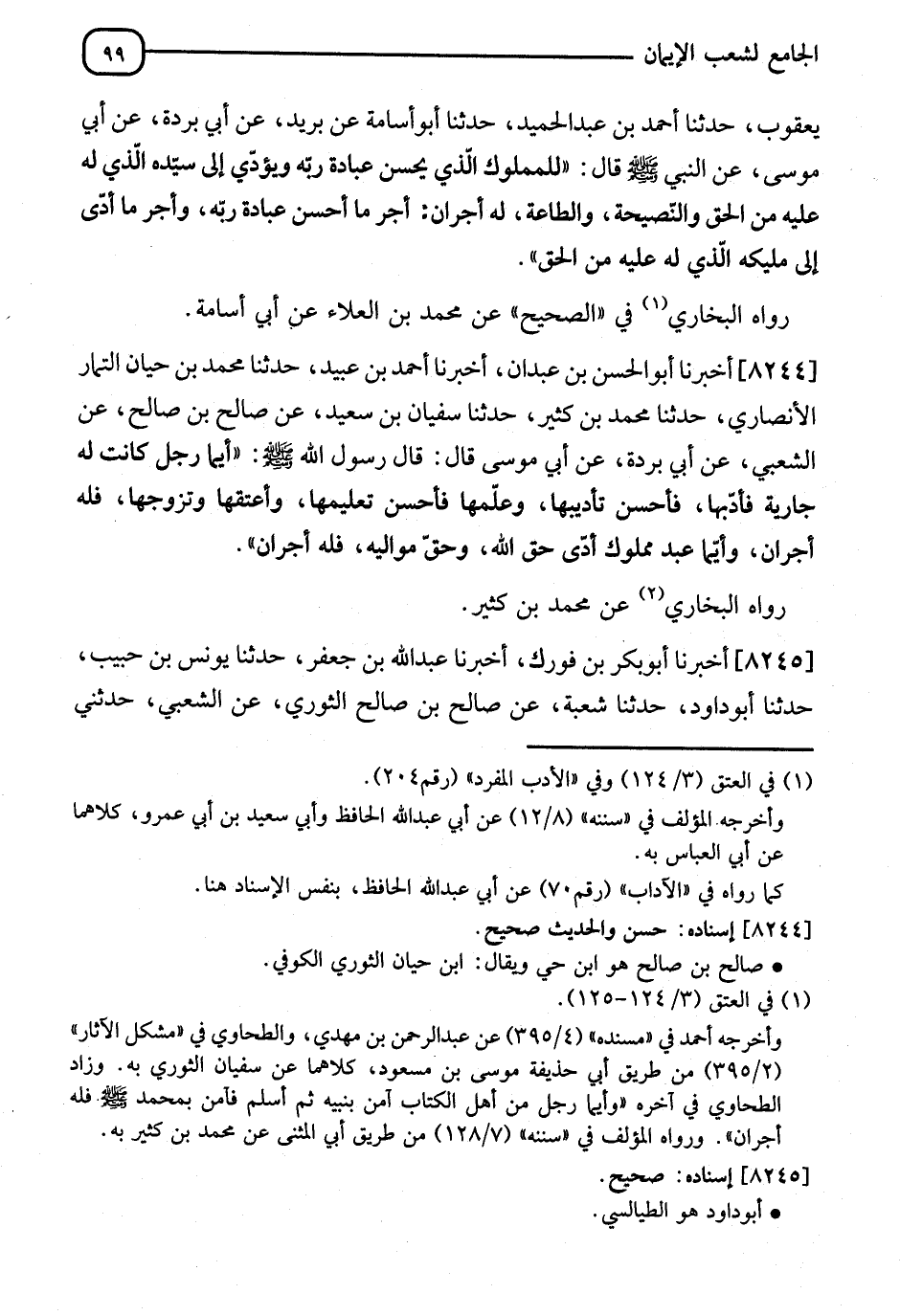 8244 - أَخْبَرَنَا أَبُو الْحَسَنِ بْنُ عَبْدَانَ، أنا أَحْمَدُ بْنُ عُبَيْدٍ، نا مُحَمَّدُ بْنُ حَيَّانَ التَّمَّارُ الْأَنْصَارِيُّ، نا مُحَمَّدُ بْنُ كَثِيرٍ، نا سُفْيَانُ بْنُ سَعِيدٍ، عَنْ صَالِحِ بْنِ صَالِحٍ، عَنِ الشَّعْبِيِّ، عَنْ أَبِي بُرْدَةَ، عَنْ أَبِي مُوسَى، قَالَ: قَالَ رَسُولُ اللهِ صَلَّى اللَّهُ عَلَيْهِ وَسَلَّمَ: " §أَيُّمَا رَجُلٍ كَانَتْ لَهُ جَارِيَةٌ فَأَدَّبَهَا فَأَحْسَنَ تَأْدِيبَهَا، وَعَلَّمَهَا فَأَحْسَنَ تَعْلِيمَهَا، وَأَعْتَقَهَا وَتَزَوَّجَهَا فَلَهُ أَجْرَانِ، وَأَيُّمَا عَبْدٍ مَمْلُوكٍ أَدَّى حَقَّ اللهِ وَحَقَّ مَوَالِيهِ فَلَهُ أَجْرَانِ " رَوَاهُ الْبُخَارِيُّ، عَنْ مُحَمَّدِ بْنِ كَثِيرٍ