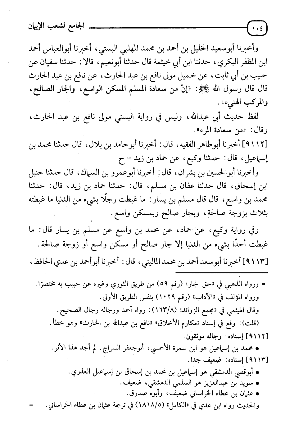 9112 - أَخْبَرَنَا أَبُو طَاهِرٍ الْفَقِيهُ، قَالَ: أَنَا أَبُو حَامِدِ بْنِ بِلَالٍ، قَالَ: نَا مُحَمَّدُ بْنُ إِسْمَاعِيلَ، قَالَ: نَا وَكِيعٌ، عَنْ حَمَّادِ بْنِ زَيْدٍ، ح وَأَخْبَرَنَا أَبُو الْحُسَيْنِ بْنُ بُشْرَانَ، قَالَ: أَنَا أَبُو عَمْرِو بْنُ السَّمَّاكِ، قَالَ: نَا حَنْبَلُ بْنُ إِسْحَاقَ، قَالَ: نَا عَفَّانُ بْنُ مُسْلِمٍ، قَالَ: نَا حَمَّادُ بْنُ زَيْدٍ، نَا مُحَمَّدُ بْنُ وَاسِعٍ، قَالَ: قَالَ مُسْلِمُ بْنُ يَسَارٍ، قَالَ: " §مَا غَبَطْتُ رَجُلًا بِشَيْءٍ مِنَ الدُّنْيَا فَأَغْبَطْتُهُ بِثَلَاثٍ: بِزَوْجَةٍ صَالِحَةٍ، وَبِجَارٍ صَالِحٍ، وَبِمَسْكَنٍ وَاسِعٍ " وَفِي رِوَايَةِ وَكِيعٍ، عَنْ حَمَّادٍ، عَنْ مُحَمَّدِ بْنِ وَاسِعٍ، عَنْ مُسْلِمِ بْنِ يَسَارٍ، قَالَ: " مَا غَبَطْتُ أَحَدًا بِشَيْءٍ مِنَ الدُّنْيَا إِلَّا جَارٌ صَالِحٌ، وَمَسْكَنٌ وَاسِعٌ، أَوْ زَوْجَةٌ صَالِحَةٌ "