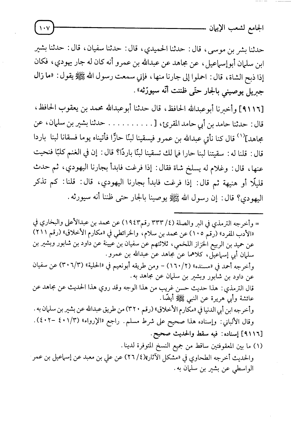 9116 - وَأَخْبَرَنَا أَبُو عَبْدِ اللهِ الْحَافِظُ، قَالَ: نَا أَبُو عَبْدِ اللهِ مُحَمَّدُ بْنُ يَعْقُوبَ الْحَافِظُ، قَالَ: نَا جَامِعُ بْنُ أَبِي حَامِدٍ الْمُقْرِئُ، قَالَ: كُنَّا نَأْتِي عَبْدَ اللهِ بْنَ عَمْرٍو فَيَسْقِينَا لَبَنًا حَارًّا، فَأَتَيْنَاهُ يَوْمًا فَسَقَانَا لَبَنًا بَارِدًا، قَالَ: قُلْنَا لَهُ: تَسْقِينَا لَبَنًا حَارًّا فَمَا لَكَ سَقَيْتَنَا لَبَنًا بَارِدًا، قَالَ: إِنَّ فِي الْغَنَمِ كَلْبًا فَتَنَحَّيْتُ عَنْهَا، قَالَ: وَغُلَامٌ لَهُ يَسْلُخُ شَاةً، فَقَالَ: إِذَا فَرَغْتَ فَابْدَأْ بِجَارِنَا الْيَهُودِيِّ، ثُمَّ حَدَّثَ قَلِيلًا أَوْ هُنَيْهَةَ، ثُمَّ قَالَ: إِذَا فَرَغْتَ فَابْدَأْ بِجَارِنَا الْيَهُودِيَّ، قَالَ: قُلْنَا: كَمْ تَذْكُرُ الْيَهُودِيَّ، قَالَ: " كَانَ رَسُولُ اللهِ صَلَّى اللَّهُ عَلَيْهِ وَسَلَّمَ §يُوصِينَا بِالْجَارِ حَتَّى ظَنَنَّا أَنَّهُ سَيُوَرِّثُهُ "