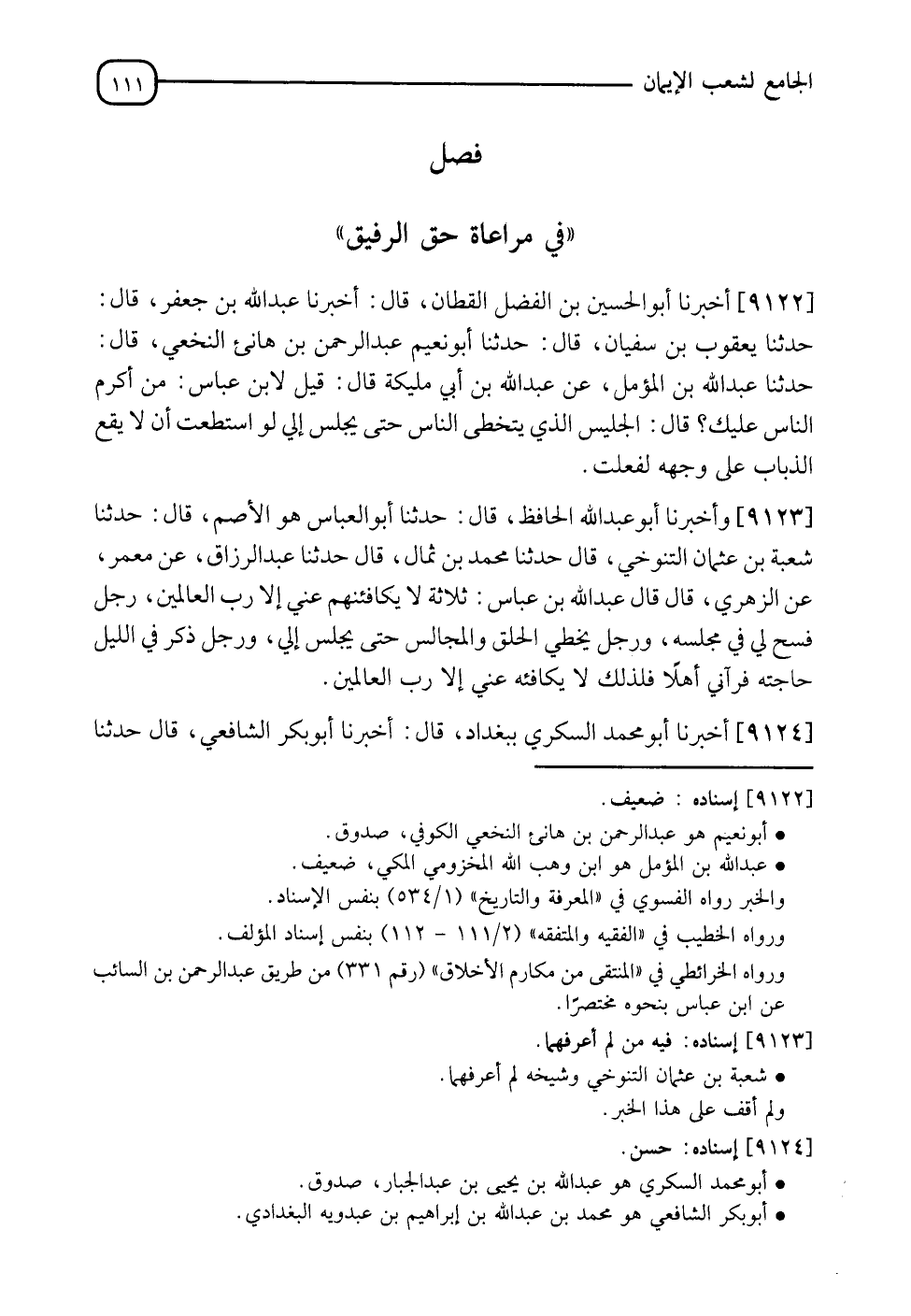 9122 - أَخْبَرَنَا أَبُو الْحُسَيْنِ بْنُ الْفَضْلِ الْقَطَّانُ، قَالَ: أَنَا عَبْدُ اللهِ بْنُ جَعْفَرٍ، قَالَ: نَا يَعْقُوبُ بْنُ سُفْيَانَ، قَالَ: نَا أَبُو نُعَيْمٍ عَبْدُ الرَّحْمَنِ بْنُ هَانِئٍ النَّخَعِيُّ، قَالَ: نَا عَبْدُ اللهِ بْنُ الْمُؤَمَّلِ، عَنْ عَبْدِ اللهِ بْنِ أَبِي مُلَيْكَةَ، قَالَ: قِيلَ لِابْنِ عَبَّاسٍ §مَنْ أَكْرَمُ النَّاسِ عَلَيْكَ؟ قَالَ: " جَلِيسِي الَّذِي يَتَخَطَّى النَّاسَ حَتَّى يَجْلِسَ إِلَيَّ، لَوِ اسْتَطَعْتُ أَنْ لَا يَقَعَ الذُّبَابُ عَلَى وَجْهِهِ لَفَعَلْتُ "