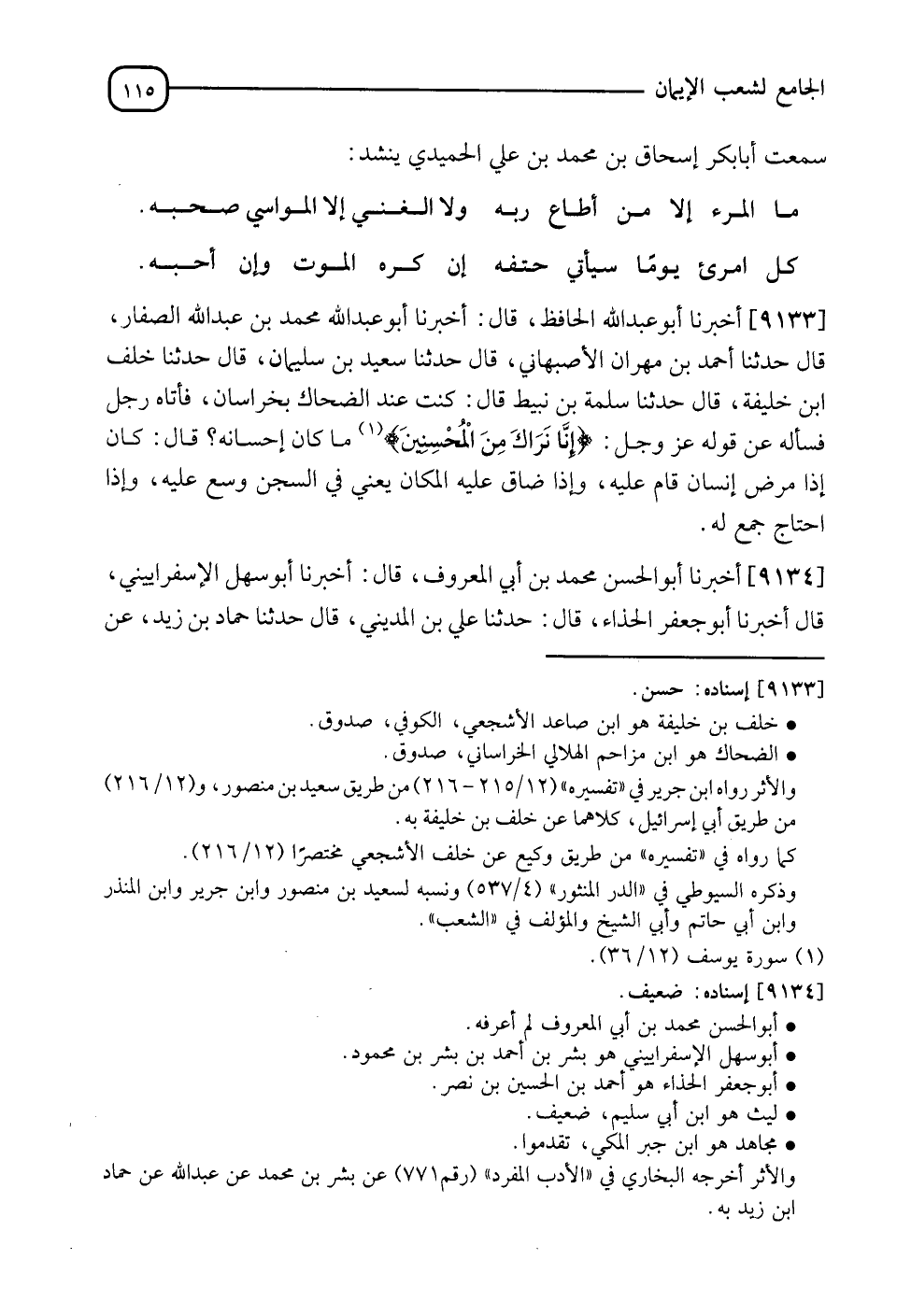 9133 - أَخْبَرَنَا أَبُو عَبْدِ اللهِ الْحَافِظُ، قَالَ: أَنَا أَبُو عَبْدِ اللهِ مُحَمَّدُ بْنُ هِبَةَ اللهِ الصَّفَّارُ، قَالَ: نَا أَحْمَدُ بْنُ مِهْرَانَ الْأَصْبَهَانِيُّ، قَالَ: نَا سَعِيدُ بْنُ سُلَيْمَانَ، قَالَ: نَا خَلَفُ بْنُ خَلِيفَةَ، قَالَ: نَا سَلَمَةُ بْنُ نُبَيْطٍ، قَالَ: كُنْتُ عِنْدَ الضَّحَّاكِ بِخُرَاسَانَ فَأَتَاهُ رَجُلٌ فَسَأَلَهُ عَنْ قَوْلِ اللهِ عَزَّ وَجَلَّ: {إِنَّا نَرَاكَ مِنَ الْمُحْسِنِينَ} [يوسف: 36] مَا كَانَ إِحْسَانُهُ؟ قَالَ: " كَانَ §إِذَا مَرِضَ إِنْسَانٌ قَامَ عَلَيْهِ، وَإِذَا ضَاقَ عَلَيْهِ الْمَكَانُ - يَعْنِي: فِي السِّجْنِ - وَسَّعَ عَلَيْهِ، وَإِذَا احْتَاجَ جَمَعَ لَهُ "