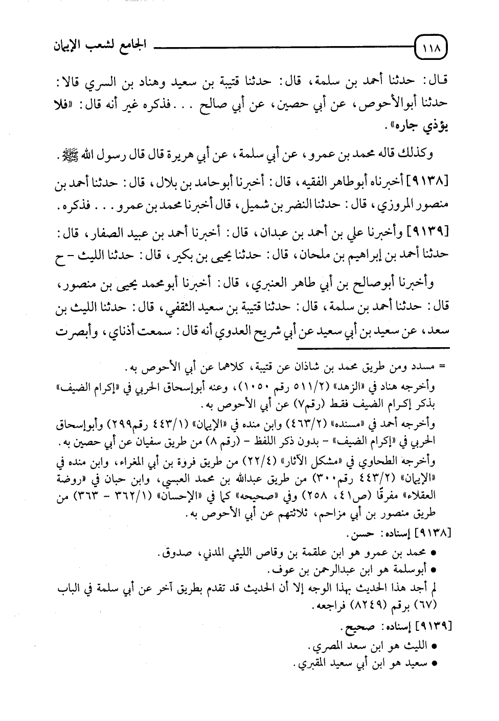 9139 - وَأَخْبَرَنَا عَلِيُّ بْنُ أَحْمَدَ بْنِ عَبْدَانَ، قَالَ: أَنَا أَحْمَدُ بْنُ عُبَيْدٍ الصَّفَّارُ، قَالَ: نَا أَحْمَدُ بْنُ إِبْرَاهِيمَ بْنِ مِلْحَانَ، قَالَ: نَا يَحْيَى بْنُ بُكَيْرٍ، قَالَ: نَا اللَّيْثُ، ح وَأَخْبَرَنَا أَبُو صَالِحِ بْنُ أَبِي طَاهِرٍ الْعَنْبَرِيُّ، قَالَ: أَنَا أَبُو مُحَمَّدٍ يَحْيَى بْنُ مَنْصُورٍ، قَالَ: نَا أَحْمَدُ بْنُ سَلَمَةَ، قَالَ: نَا قُتَيْبَةُ بْنُ سَعِيدٍ الثَّقَفِيُّ، قَالَ: نَا اللَّيْثُ بْنُ سَعْدٍ، عَنْ سَعِيدِ بْنِ أَبِي سَعِيدٍ، عَنْ أَبِي شُرَيْحٍ الْعَدَوِيِّ، أَنَّهُ قَالَ: سَمِعِتْ أُذُنَايَ وَأَبْصَرَتْ -[119]- عَيْنَايَ حِينَ تَكَلَّمَ رَسُولُ اللهِ صَلَّى اللَّهُ عَلَيْهِ وَسَلَّمَ، فَقَالَ: §" مَنْ كَانَ يُؤْمِنُ بِاللهِ وَالْيَوْمِ الْآخِرِ فَلْيُكْرِمْ ضَيْفَهُ جَائِزَتَهُ " قَالُوا: وَمَا جَائِزَتُهُ، قَالَ: " يَوْمُهُ وَلَيْلَتُهُ وَالضِّيَافَةُ ثَلَاثَةً، فَمَا كَانَ وَرَاءَ ذَلِكَ فَهُوَ صَدَقَةٌ عَلَيْهِ "، وَقَالَ: " مَنْ كَانَ يُؤْمِنُ بِاللهِ وَالْيَوْمِ الْآخِرِ فَلْيَقُلْ خَيْرًا أَوْ لِيَصْمُتْ "، لَفْظُ حَدِيثِ قُتَيْبَةَ، وَزَادَ ابْنُ بُكَيْرٍ فِي أَوَّلِ هَذَا الْحَدِيثِ: " مَنْ كَانَ يُؤْمِنُ بِاللهِ وَالْيَوْمِ الْآخِرِ فَلْيُكْرِمْ جَارَهُ "، ثُمَّ ذَكَرَ الْبَاقِيَ نَحْوَهُ، رَوَاهُ مُسْلِمٌ فِي الصَّحِيحِ، عَنْ قُتَيْبَةَ، وَرَوَاهُ الْبُخَارِيُّ، عَنِ ابْنِ يُوسُفَ، وَغَيْرُهُ، عَنِ اللَّيْثِ