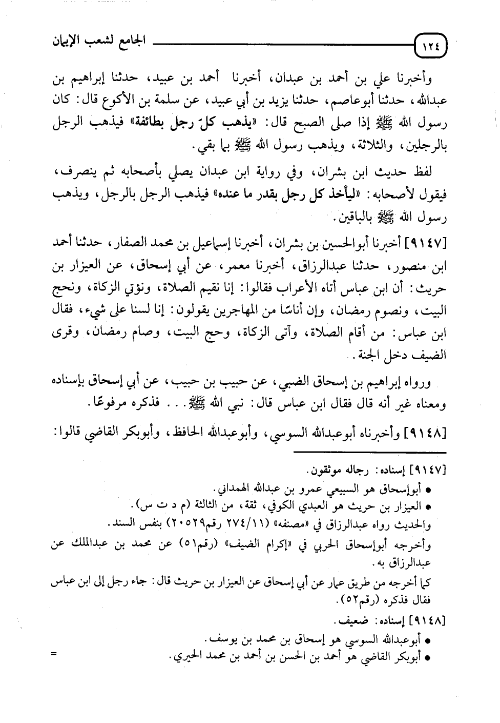 9147 - أَخْبَرَنَا أَبُو الْحُسَيْنِ بْنُ بُشْرَانَ، أَنَا إِسْمَاعِيلُ بْنُ مُحَمَّدٍ الصَّفَّارُ، نَا أَحْمَدُ بْنُ مَنْصُورٍ، نَا عَبْدُ الرَّزَّاقِ، أَنَا مَعْمَرٌ، عَنْ أَبِي إِسْحَاقَ، عَنِ الْعَيْزَارِ بْنِ حُرَيْثٍ، أَنَّ ابْنَ عَبَّاسٍ أَتَاهُ الْأَعْرَابُ، فَقَالُوا: إِنَّا نُقِيمُ الصَّلَاةَ، وَنُؤْتِي الزَّكَاةَ، وَنَحُجُّ الْبَيْتَ، وَنَصُومُ رَمَضَانَ، وَإِنَّ أُنَاسًا مِنَ الْمُهَاجِرِينَ يَقُولُونَ: إِنَّا لَسْنَا عَلَى شَيْءٍ، فَقَالَ ابْنُ عَبَّاسٍ: " §مَنْ أَقَامَ الصَّلَاةَ، وَآتَى الزَّكَاةَ، وَحَجَّ الْبَيْتَ، وَصَامَ رَمَضَانَ، وَقَرَى الضَّيْفَ دَخَلَ الْجَنَّةَ " وَرَوَاهُ إِبْرَاهِيمُ بْنُ إِسْحَاقَ الضَّبِّيُّ، عَنْ حَبِيبِ بْنِ حَبِيبٍ، عَنْ أَبِي إِسْحَاقَ، بِإِسْنَادِهِ وَمَعْنَاهُ، غَيْرَ أَنَّهُ قَالَ: فَقَالَ ابْنُ عَبَّاسٍ: قَالَ نَبِيُّ اللهِ صَلَّى اللَّهُ عَلَيْهِ وَسَلَّمَ، فَذَكَرَهُ مَرْفُوعًا،