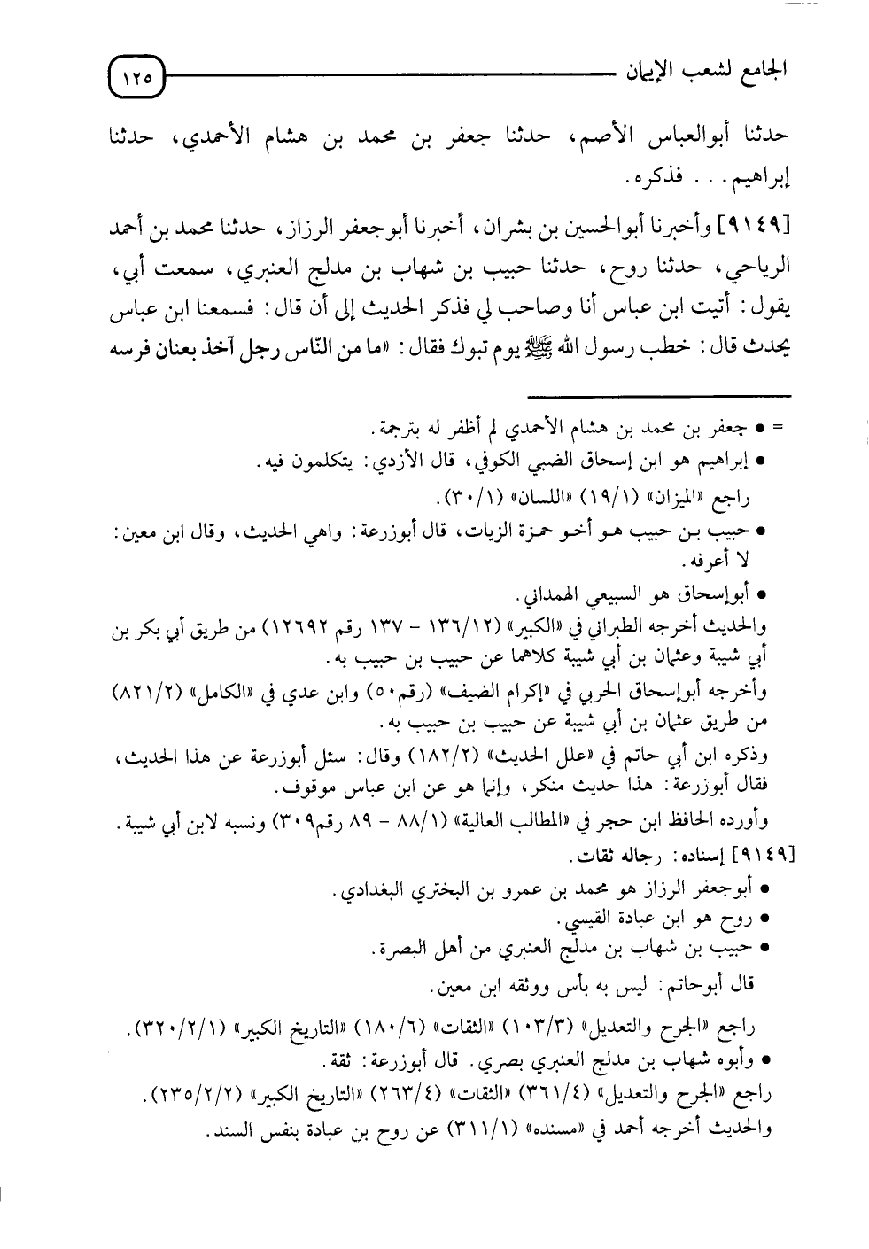 9149 - وَأَخْبَرَنَا أَبُو الْحُسَيْنِ بْنُ بُشْرَانَ، أَنَا أَبُو جَعْفَرٍ الرَّزَّازُ، نَا مُحَمَّدُ بْنُ أَحْمَدَ بْنِ أَحْمَدَ الرِّيَاحِيُّ، نَا رَوْحٌ، نَا حَبِيبُ بْنُ شِهَابِ بْنِ مُدْلِجٍ الْعَنْبَرِيُّ، سَمِعْتُ أَبِي يَقُولُ: أَتَيْتُ ابْنَ عَبَّاسٍ، أَنَا وَصَاحِبٌ لِي، فَذَكَرَ الْحَدِيثَ، إِلَى أَنْ قَالَ: فَسَمِعْنَا ابْنَ عَبَّاسٍ يُحَدِّثُ، قَالَ: خَطَبَ رَسُولُ اللهِ صَلَّى اللَّهُ عَلَيْهِ وَسَلَّمَ يَوْمَ تَبُوكَ، فَقَالَ: " §مَا مِنَ النَّاسِ رَجُلٌ آخُذٌ بِعِنَانِ فَرَسِهِ، -[126]- فَيُجَاهِدُ فِي سَبِيلِ اللهِ وَيَجْتَنِبُ شُرُورَ النَّاسِ، وَمَثَلُ رَجُلٍ بَادٍي فِي غَنَمِهِ يَقْرِي ضَيْفَهُ وَيُؤَدِّي حَقَّهُ "، قَالَ: قُلْتُ: أَقَالَهَا؟ قَالَ: " قَالَهَا "، قَالَ: قُلْتُ: أَقَالَهَا؟ قَالَ: " قَالَهَا "، قَالَ: قُلْتُ: أَقَالَهَا؟ قَالَ: " قَالَهَا "، فَكَبَّرْتُ اللهَ وَحَمِدْتُهُ وَسَكَتُّ