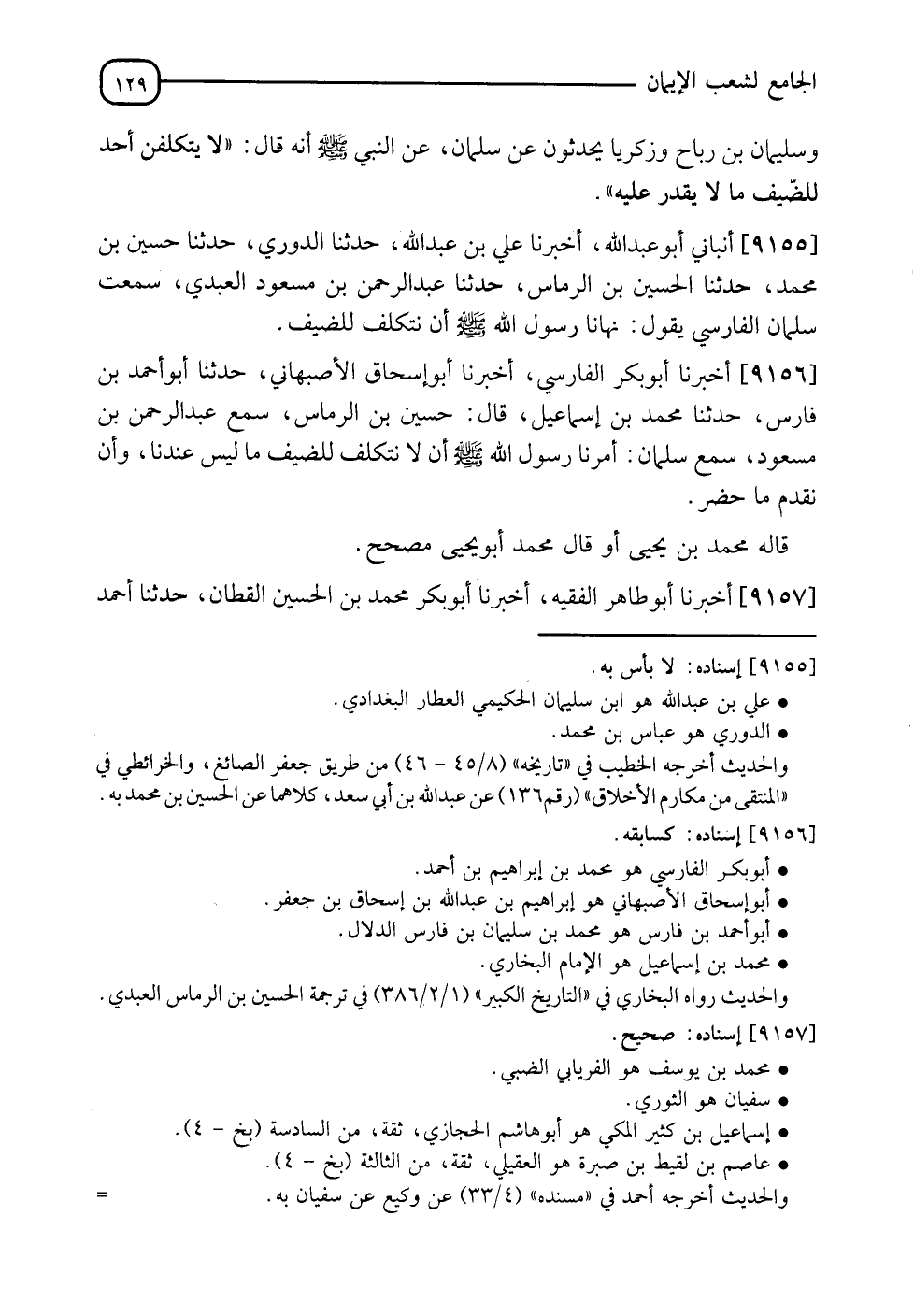 9156 - أَخْبَرَنَا أَبُو بَكْرٍ الْفَارِسِيُّ، أَنَا أَبُو إِسْحَاقَ الْأَصْبَهَانِيُّ، نَا أَبُو أَحْمَدَ بْنُ فَارِسٍ، نَا مُحَمَّدُ بْنُ إِسْمَاعِيلَ، قَالَ: حُسَيْنُ بْنُ الرِّيَاشِيِّ، سَمِعَ عَبْدَ الرَّحْمَنِ بْنَ مَسْعُودٍ، سَمِعَ سَلْمَانَ، §" أَمَرَنَا رَسُولُ اللهِ صَلَّى اللَّهُ عَلَيْهِ وَسَلَّمَ أَنْ لَا نَتَكَلَّفَ لِلضَّيْفِ مَا لَيْسَ عِنْدَنَا، وَأَنْ نُقَدِّمَ مَا حَضَرَ " قَالَهُ مُحَمَّدُ بْنُ يَحْيَى، أَوْ قَالَ: مُحَمَّدٌ أَبُو يَحْيَى مُصَحَّحٌ