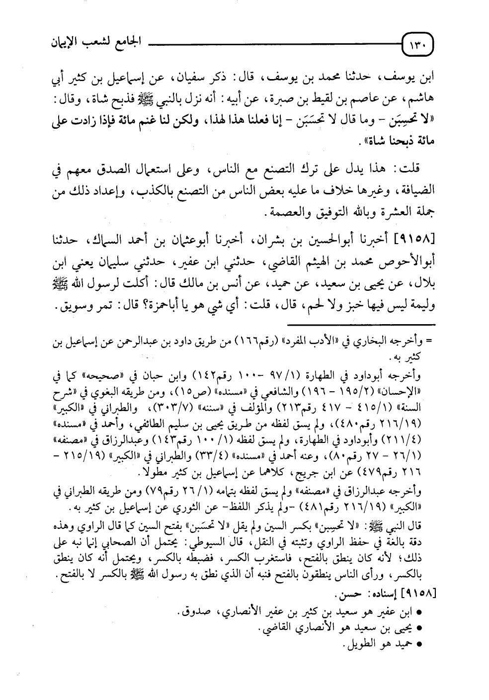9158 - أَخْبَرَنَا أَبُو الْحُسَيْنِ بْنُ بُشْرَانَ، أَنَا عُثْمَانُ بْنُ أَحْمَدَ بْنِ السَّمَّاكِ، نَا أَبُو الْأَحْوَصِ مُحَمَّدُ بْنُ الْهَيْثَمِ الْقَاضِي، حَدَّثَنِي ابْنُ عُفَيْرٍ، حَدَّثَنِي سُلَيْمَانُ يَعْنِي ابْنَ بِلَالٍ، عَنْ يَحْيَى بْنِ سَعِيدٍ، عَنْ حُمَيْدٍ، عَنْ أَنَسِ بْنِ مَالِكٍ، قَالَ: §" أَكَلَتُ لِرَسُولِ اللهِ صَلَّى اللَّهُ عَلَيْهِ وَسَلَّمَ وَلِيمَةً لَيْسَ فِيهَا خُبْزٌ وَلَا لَحْمٌ "، قَالَ: قُلْتُ: " أَيُّ شَيْءٍ هُوَ يَا أَبَا حَمْزَةَ "، قَالَ: تَمْرٌ وَسَوِيقٌ -[131]- رَوَاهُ الْبُخَارِيُّ، عَنْ إِسْمَاعِيلَ بْنِ أَبِي أُوَيْسٍ، عَنْ أَخِيهِ، عَنْ سُلَيْمَانَ بْنِ بِلَالٍ